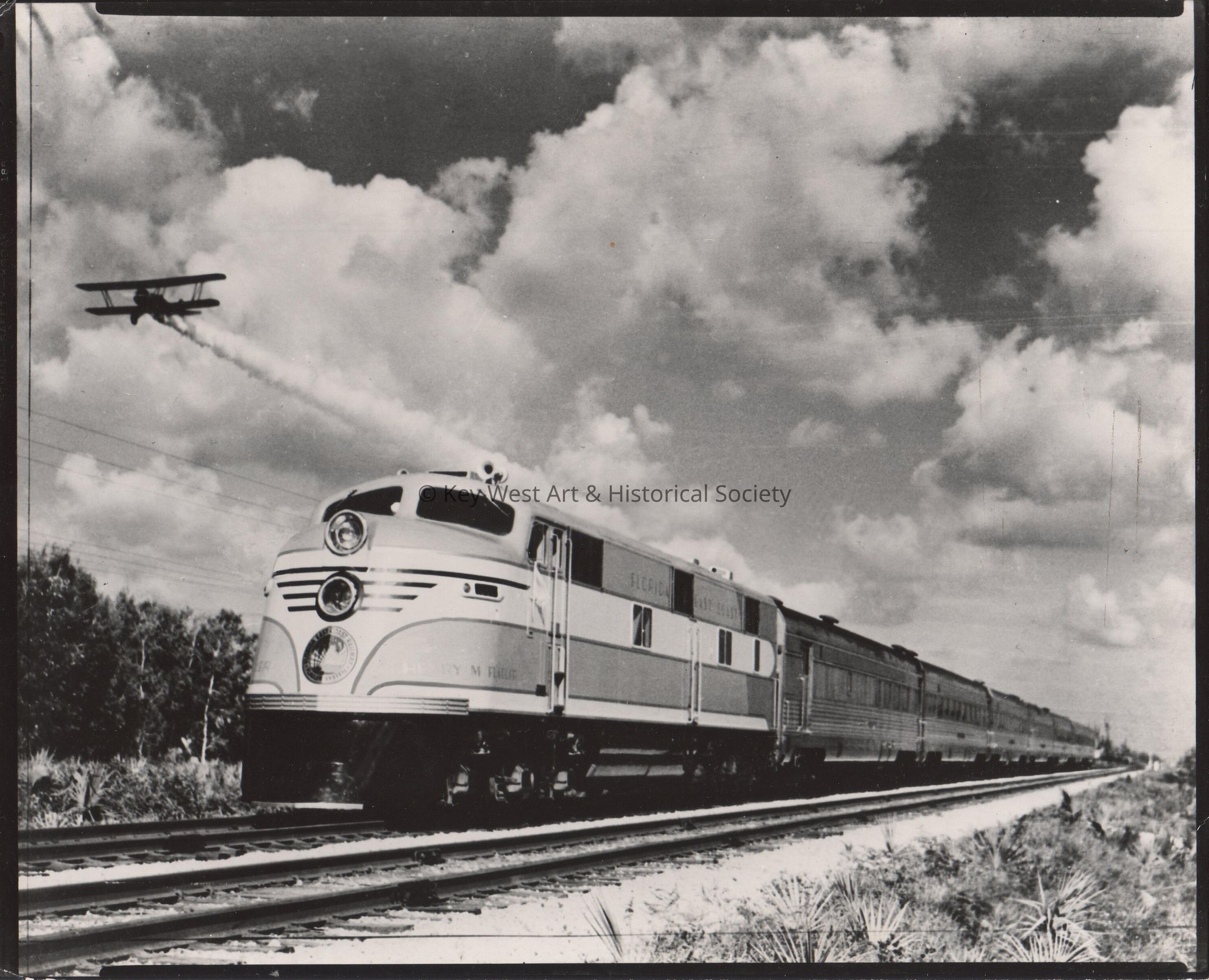 An airplane flying near a Florida East Coast train.Collection