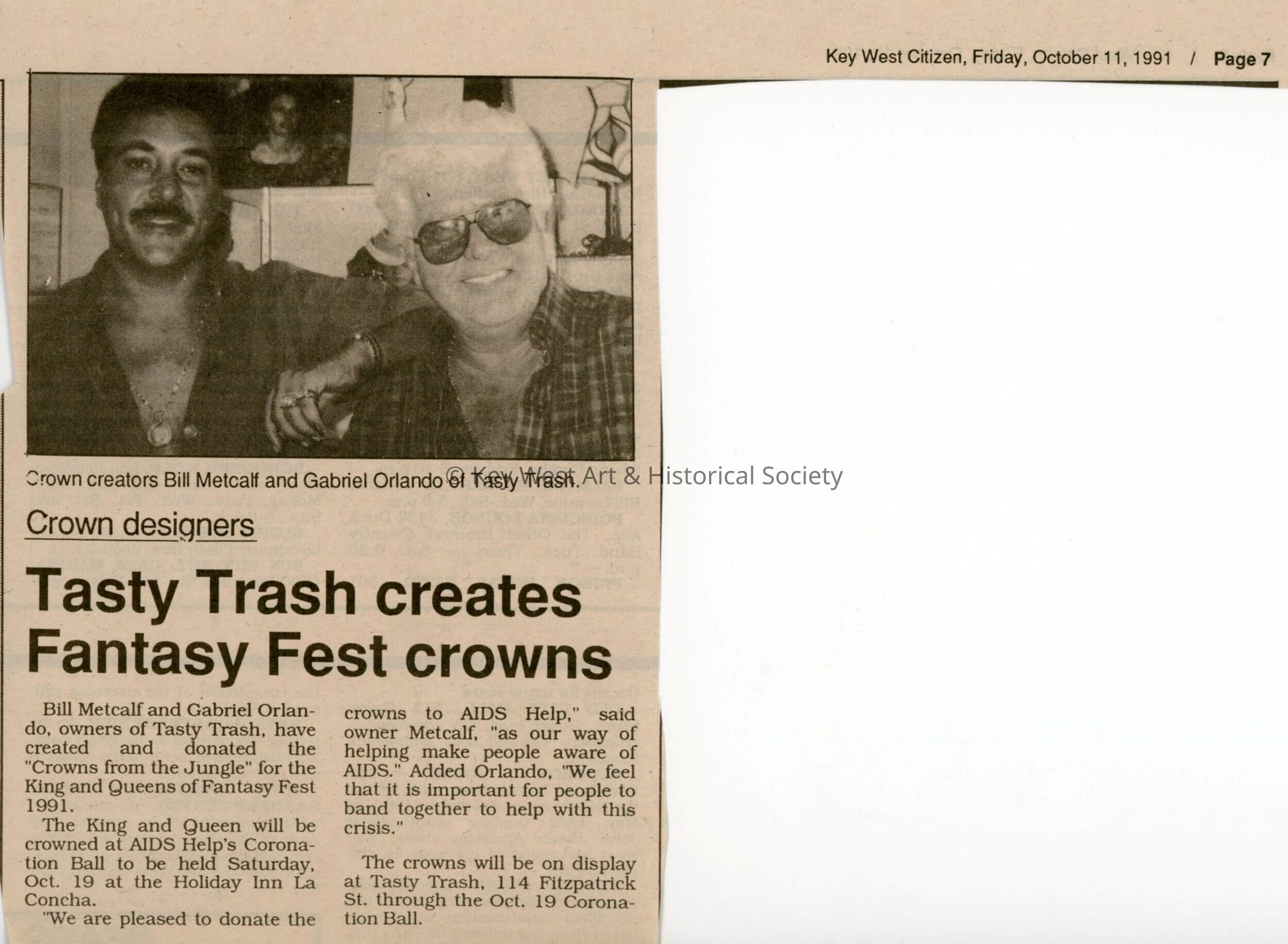 An article and a picture in the Key West Citizen that reads Tasty Trash creates Fantasy Fest crowns.