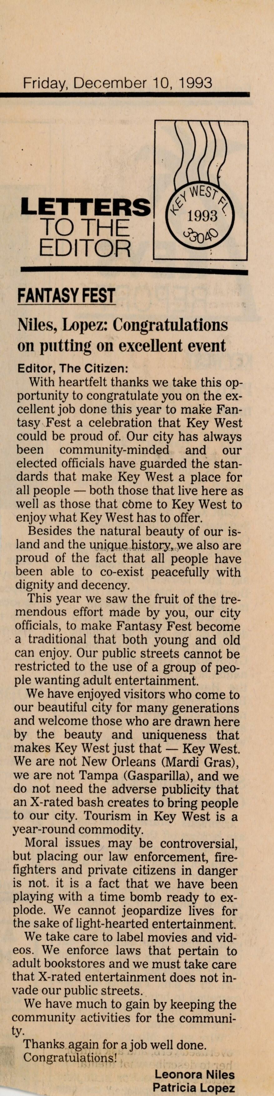 An article in the Key West Citizen about Fantasy Fest that reads Niles, Lopez: Congratulations on putting on excellent event.Entry/Object ID