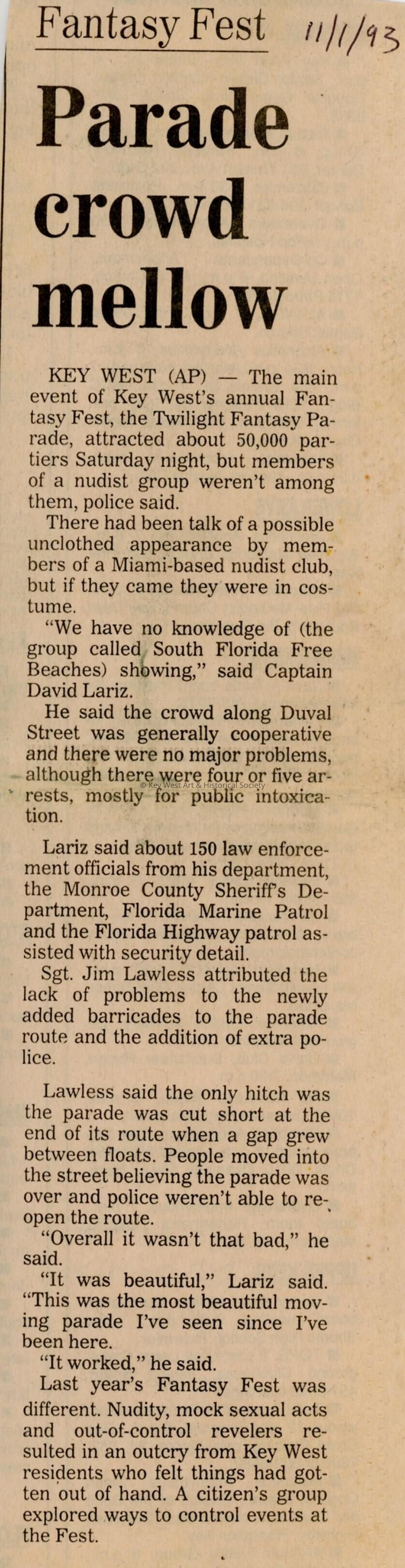 An article in the Key West Citizen about Fantasy Fest that reads Parade crowd mellow.