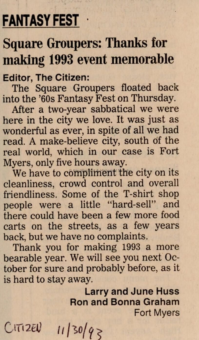 An article in the Key West Citizen about Fantasy Fest that reads Square Groupers: Thanks for making 1993 event memorable.