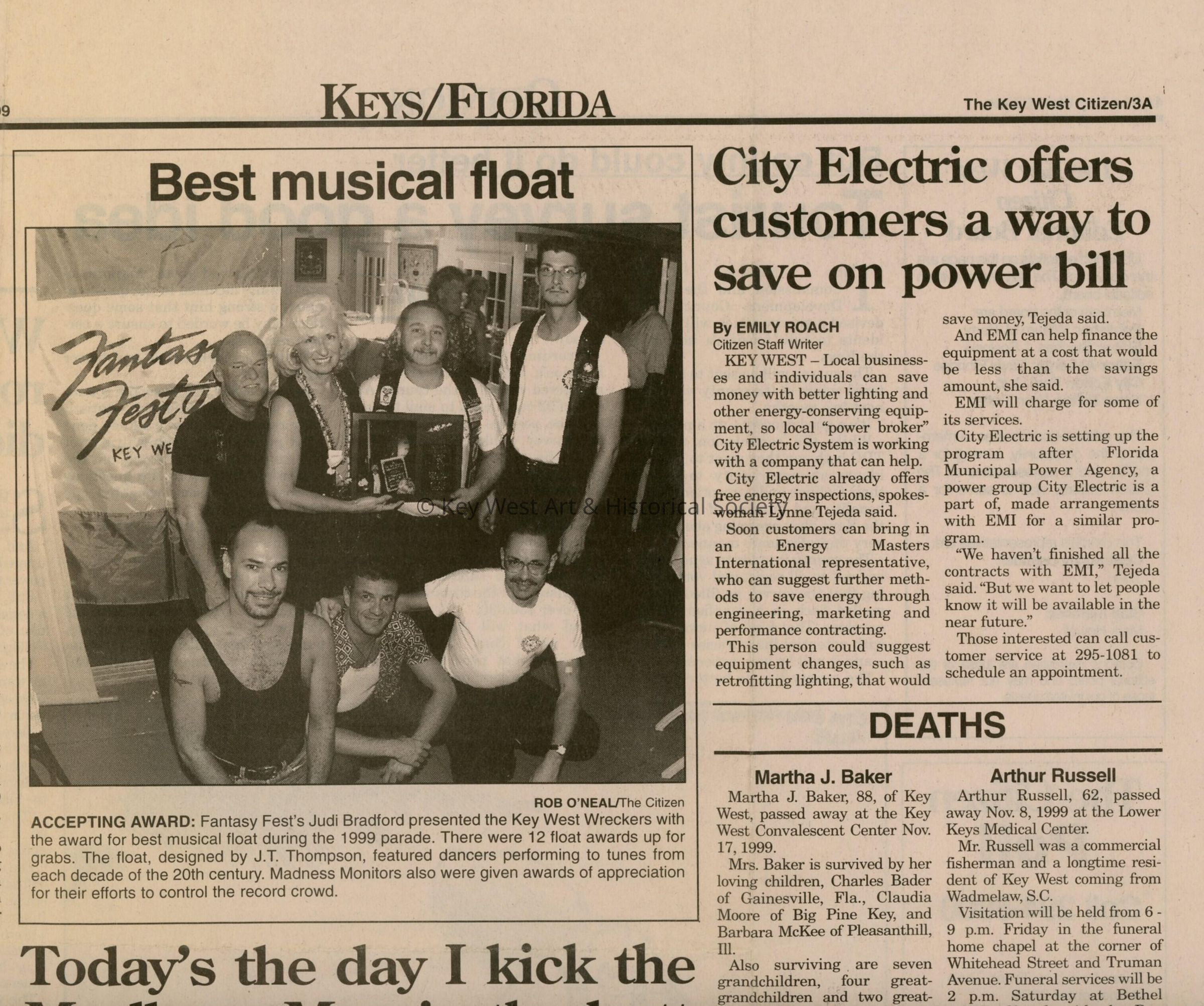 An article in the Key West Citizen that reads Best musical float.