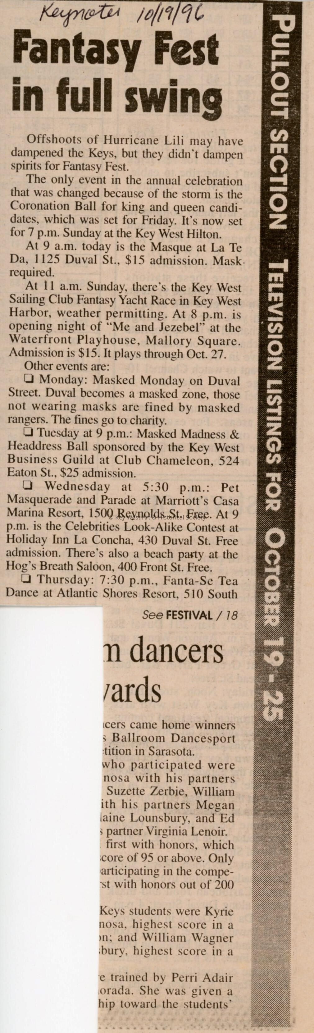 An article in the Keynoter about Fantasy Fest that reads Fantasy Fest in full swing.