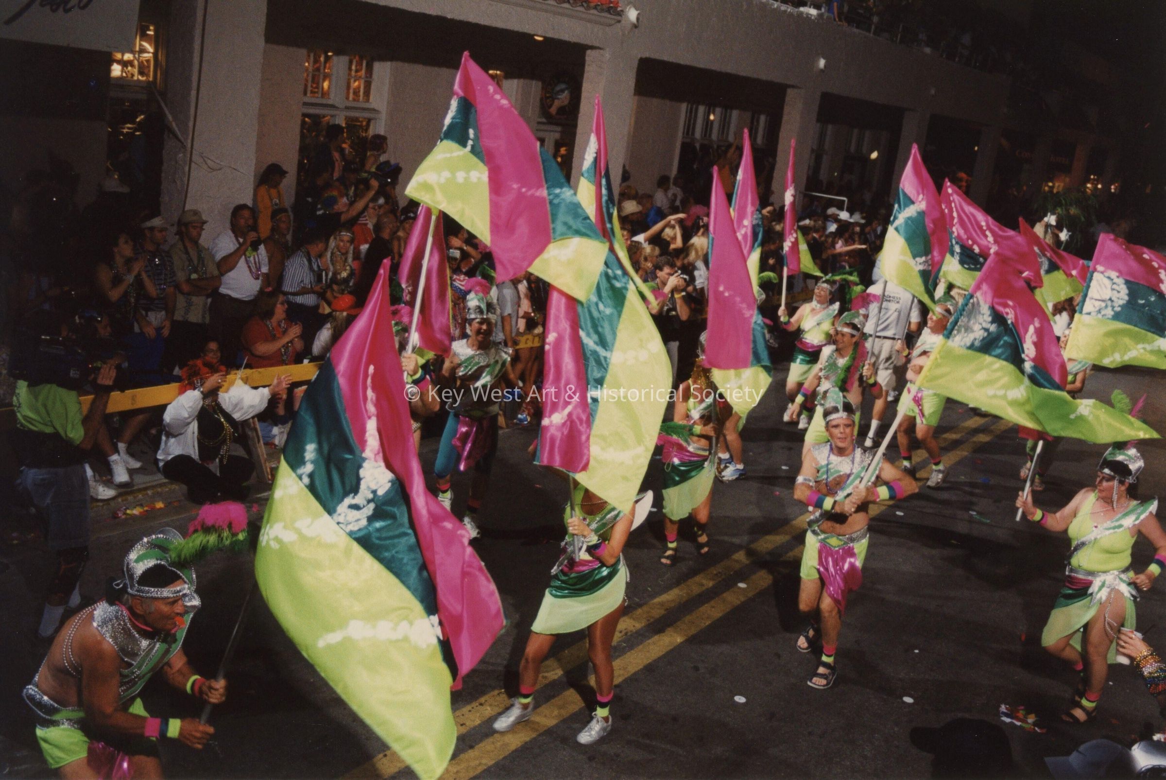 An unknown group of people dressed up walking in the street for the parade.Collection