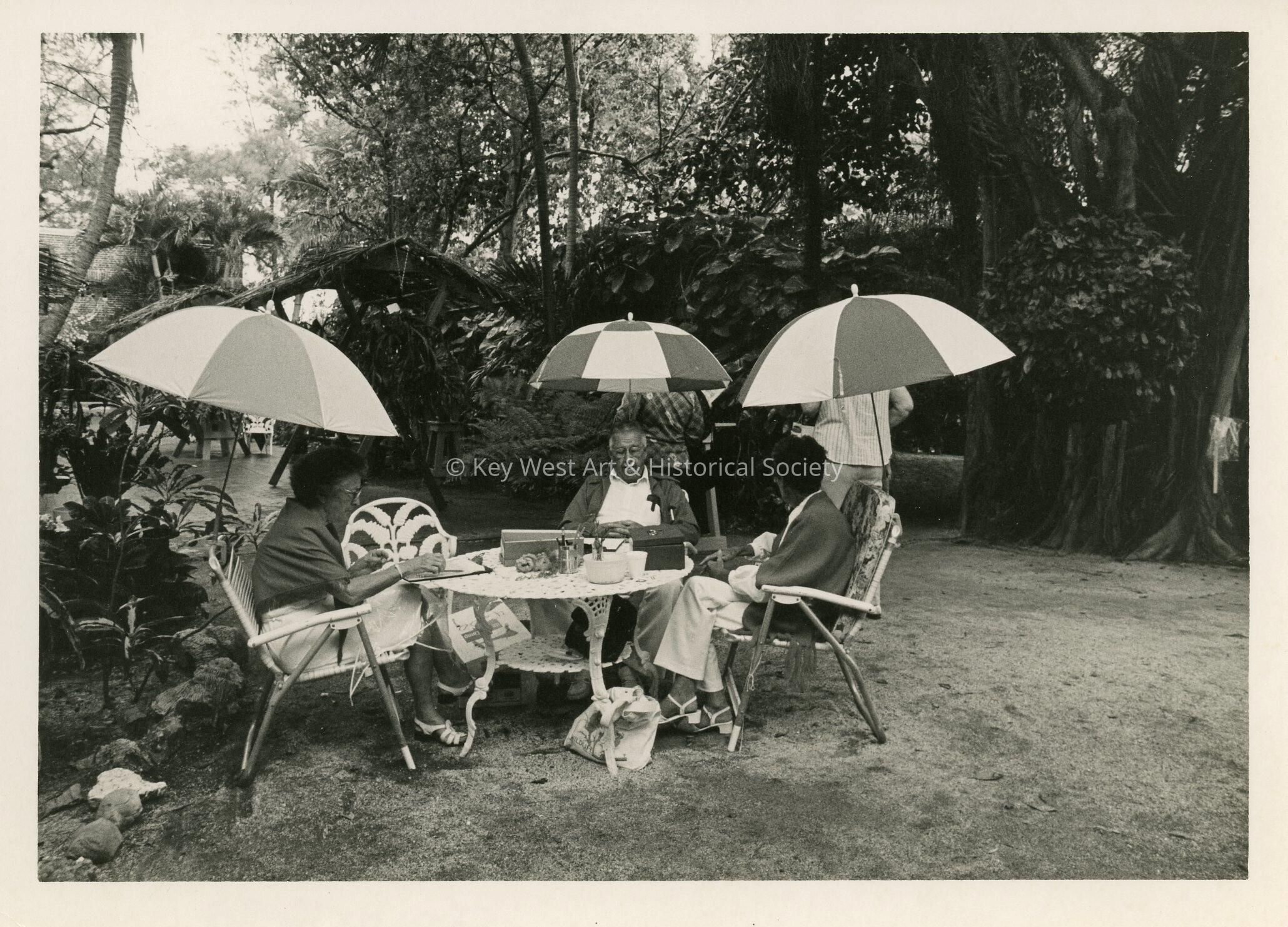 An unknown group of people sitting at a table with colorful umbrellas.Collection