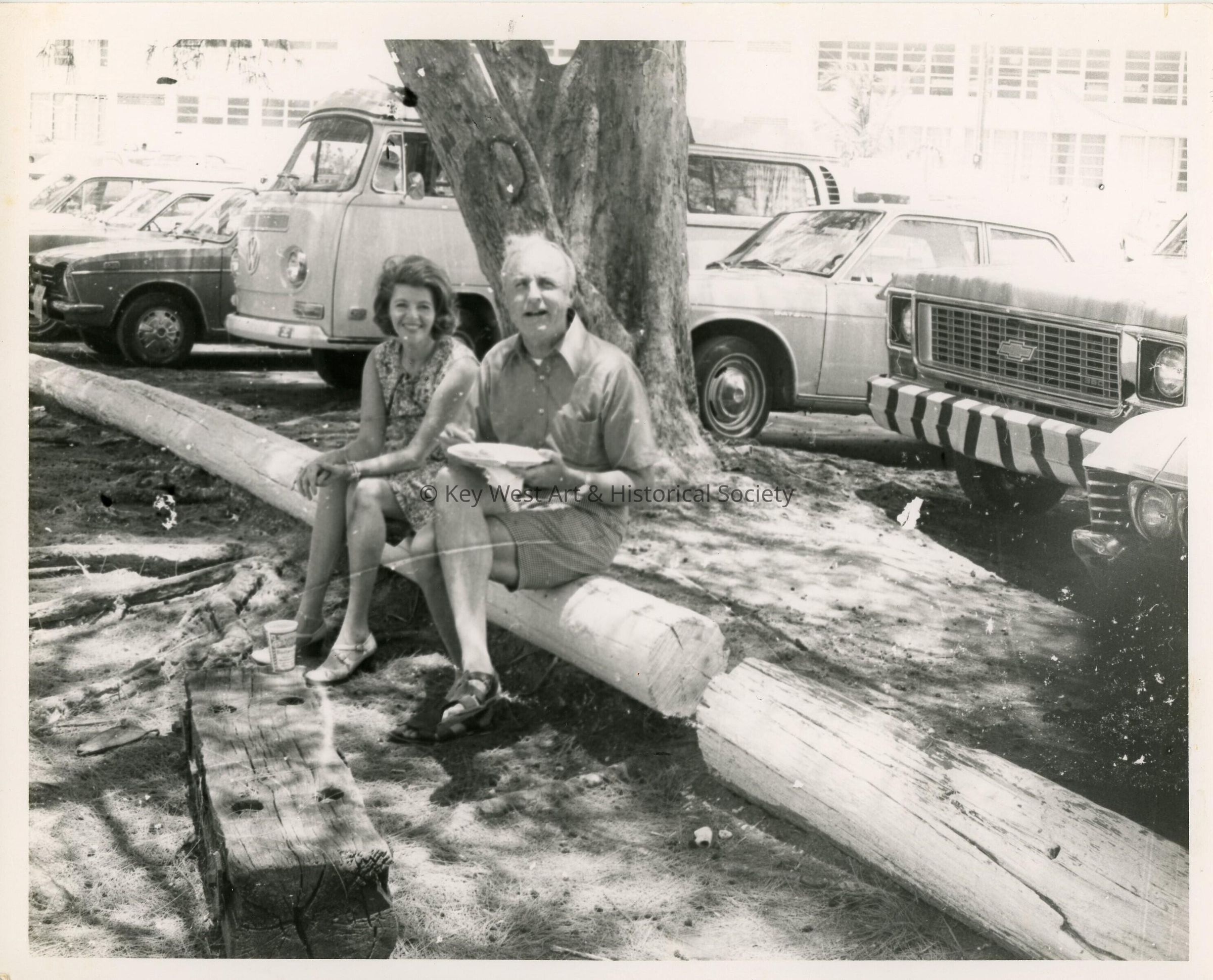 An unknown male and female eating while sitting on a logCollection