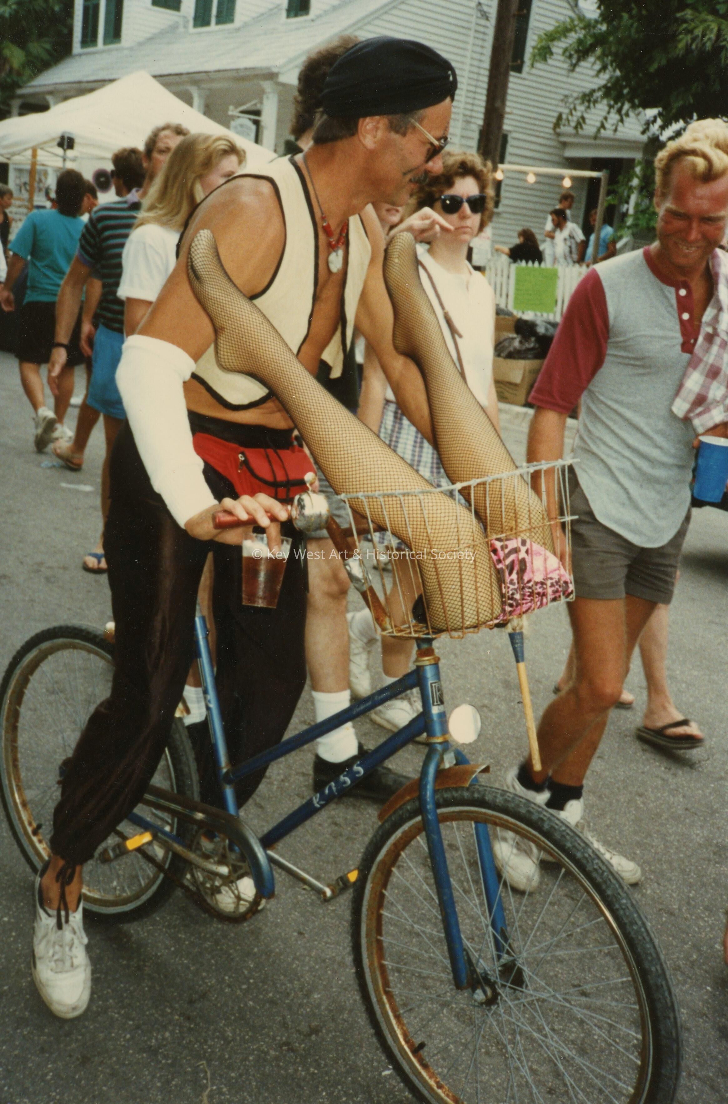 An unknown man dressed up on a bike.