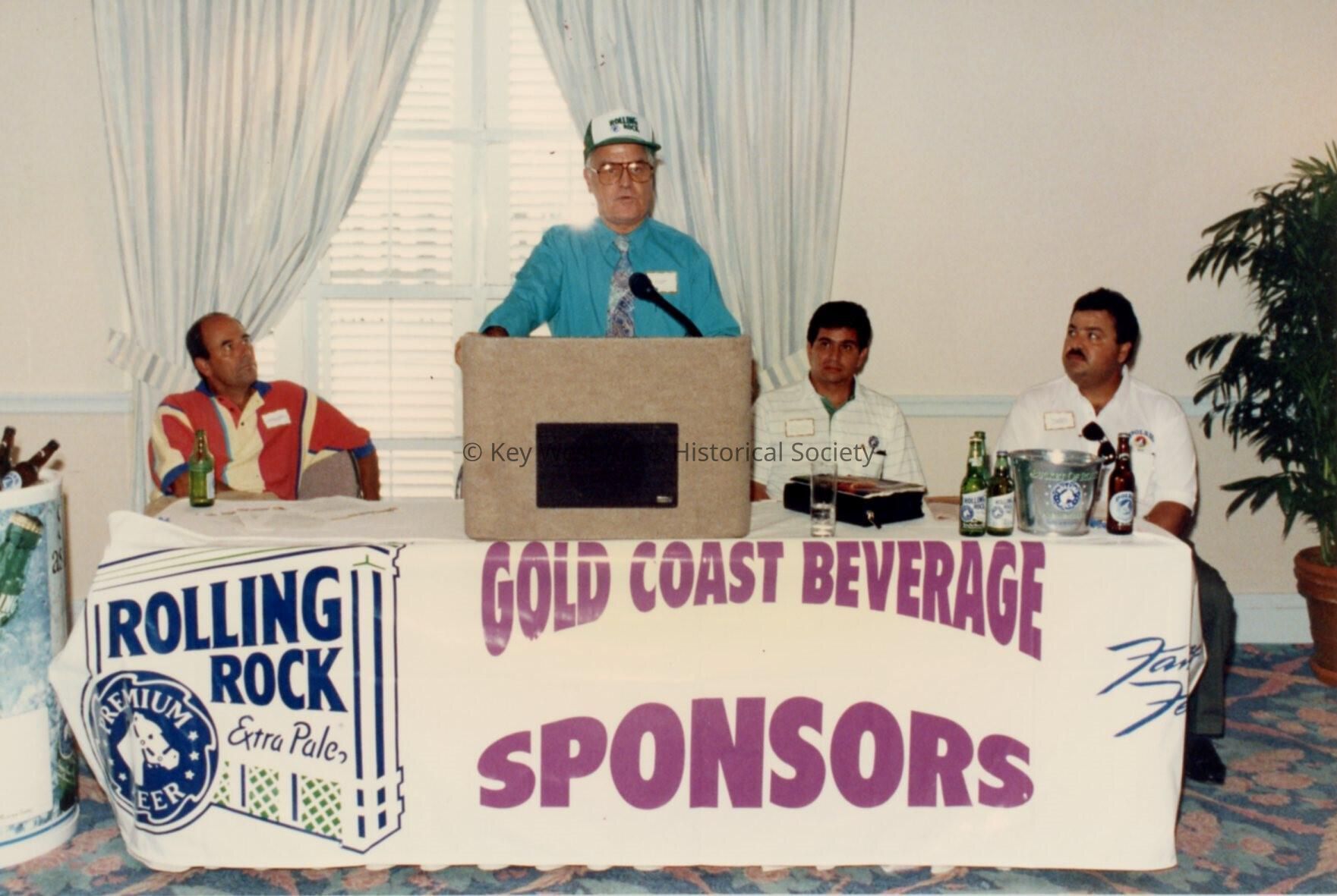 An unknown man speaking at the podium, a sign reads Gold Coast beverage sponsors under him.Entry/Object ID