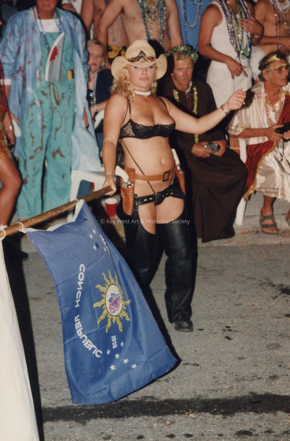 An unknown woman dressed up holding a Conch Republic.Entry/Object ID