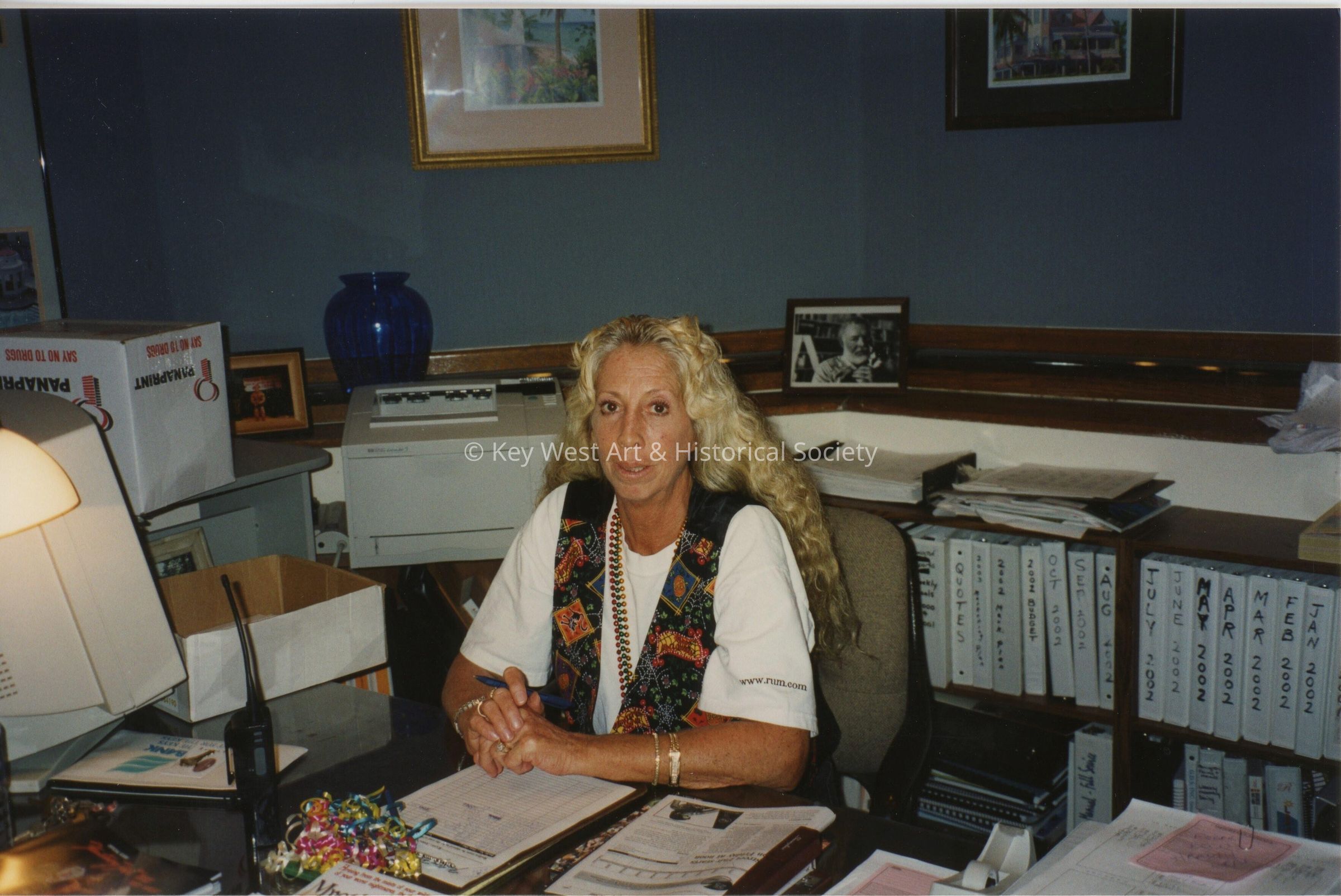 An unknown woman sitting at a desk.