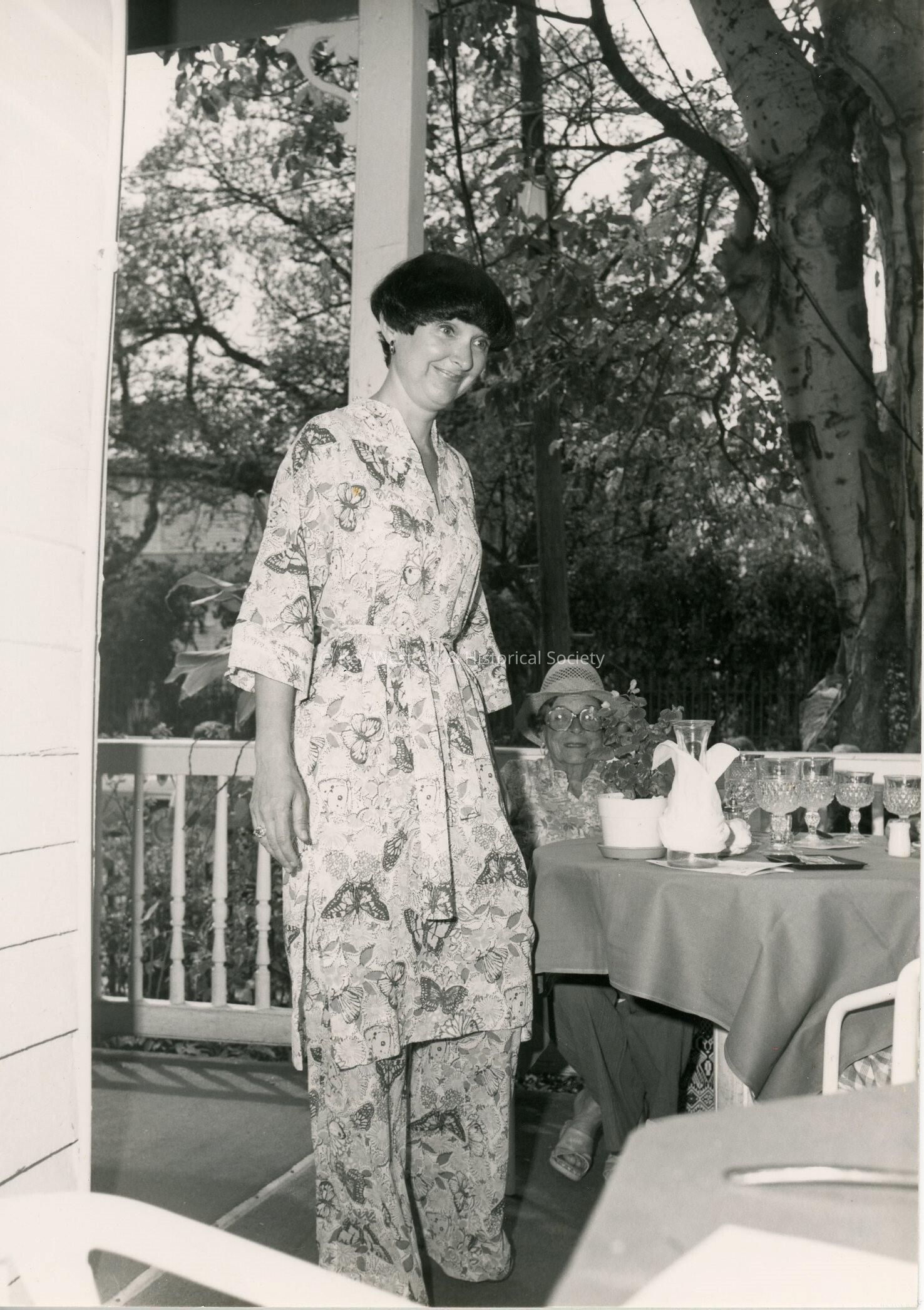 An unknown woman standing outside near a table.