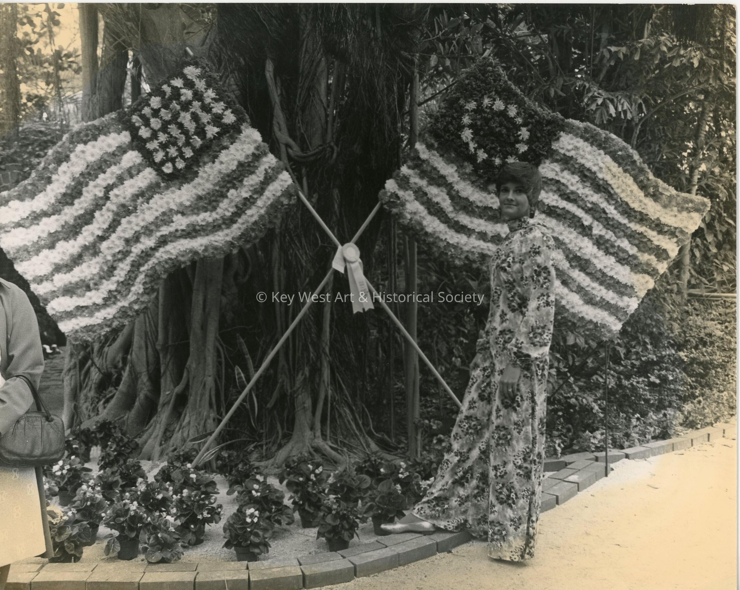 An unknown woman standing next to a tree and 2 flagsEntry/Object ID