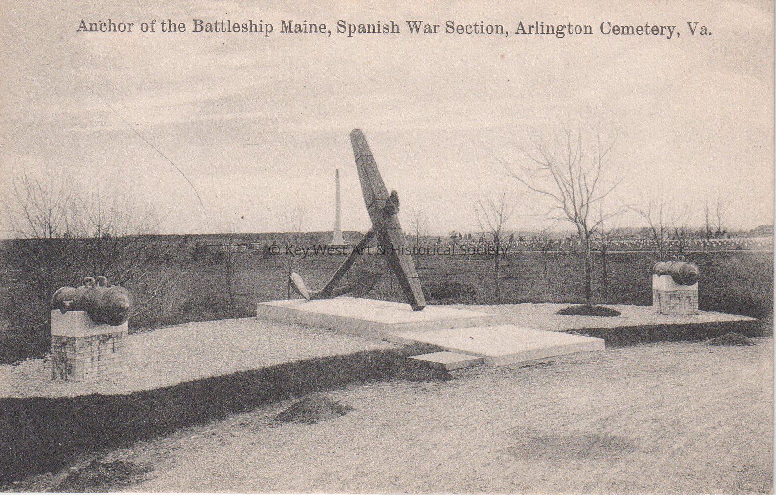 Postcard depicting the anchor from the U.S.S. MAINE. The caption reads, ‘Anchor of the Battleship Maine, Spanish War Section, Arlington Cemetery, Va.’ The description on the verso reads, ‘In the Arlington National Cemetery the anchor of the “Maine” blown up in Havana Harbor, February 16, 1898, marks the grave of 163 of the crew who were killed in the explosion. The anchor is flanked by two Spanish mortars.‘Subject Place