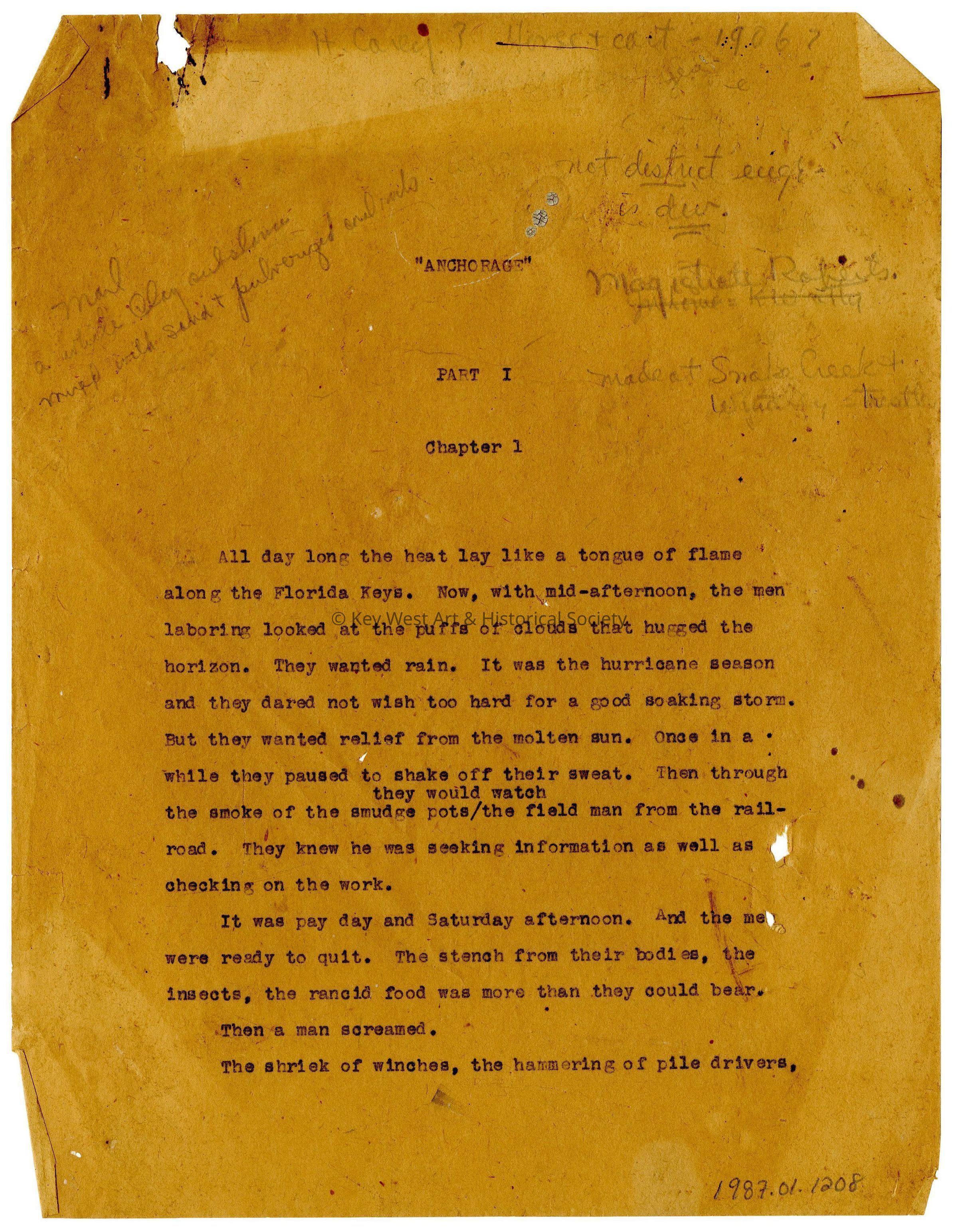 Typewritten and hand-corrected manuscript by Louise White titled, 'Anchorage'. Appears to be an incomplete draft of twenty-five pages.Collection