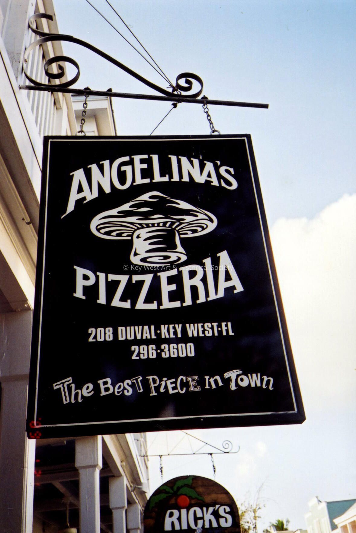 Color photograph taken by historian James M. Goode of the Angelina's Pizzeria sign at 208 Duval Street during a trip to Key West in February 2001. Printed from Roll 8.