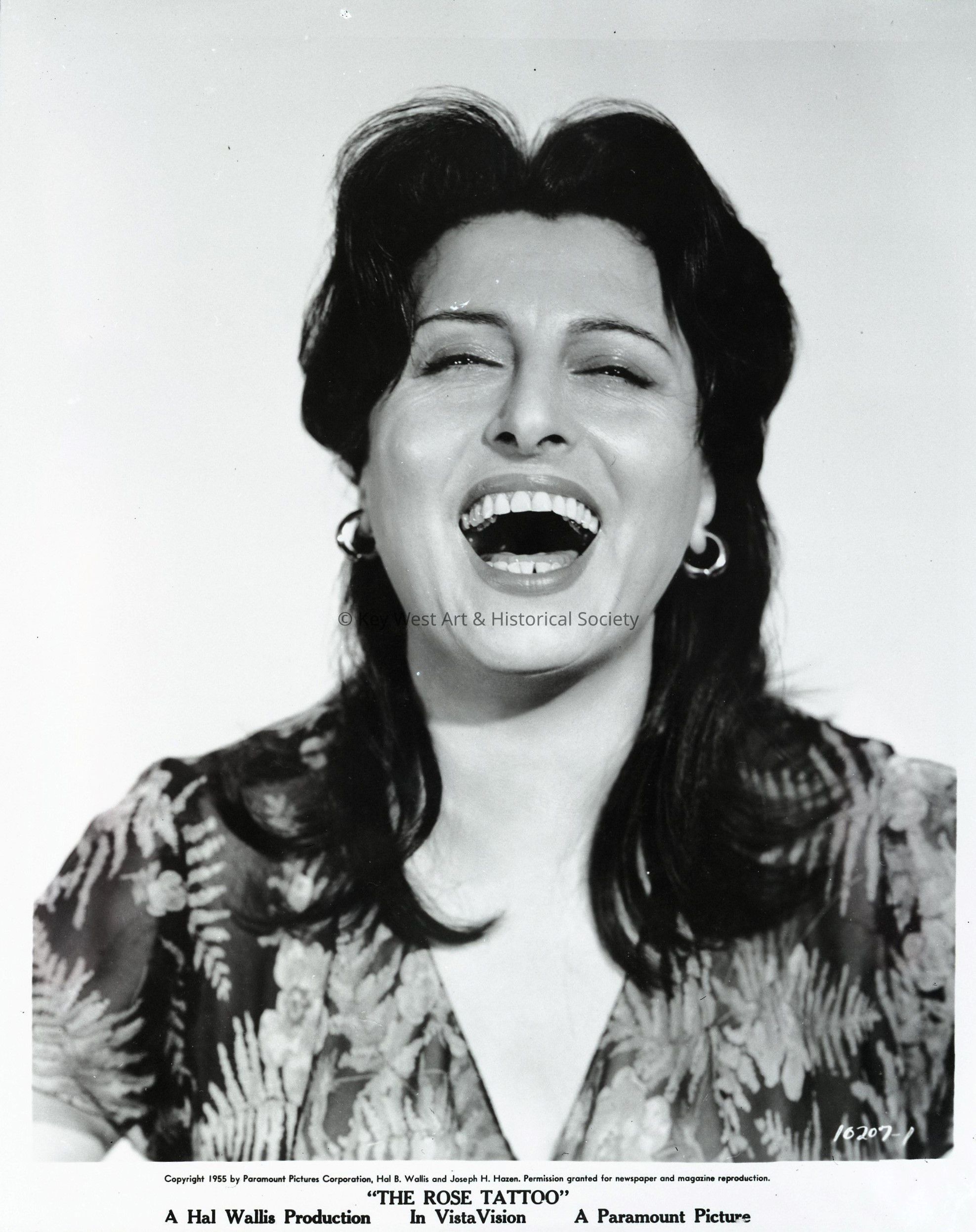 Black and white film negative from the movie adaptation of 'The Rose Tattoo' by Tennessee Williams featuring Anna Magnani.