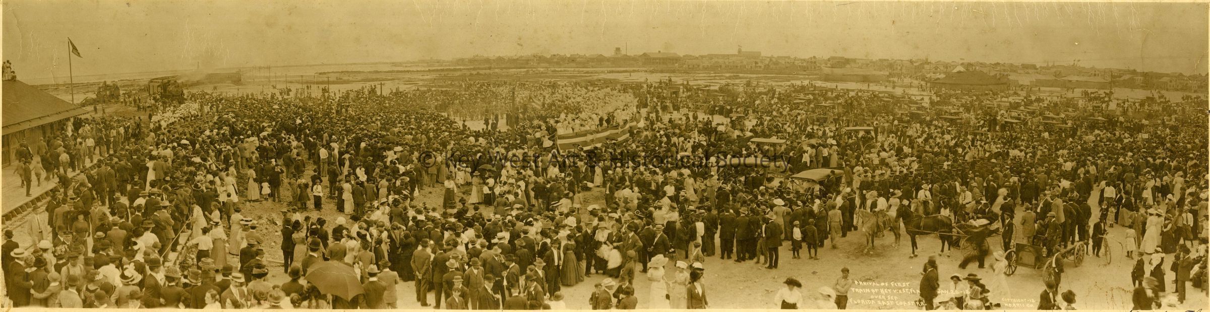 Black and white panorama of the arrival of the first Overseas Railway train into Key West. The Overseas Railway was a section of the Florida East Coast Railway. On the train was Henry M. Flagler, the man largely responsible for connecting the Florida Keys to mainland Florida.