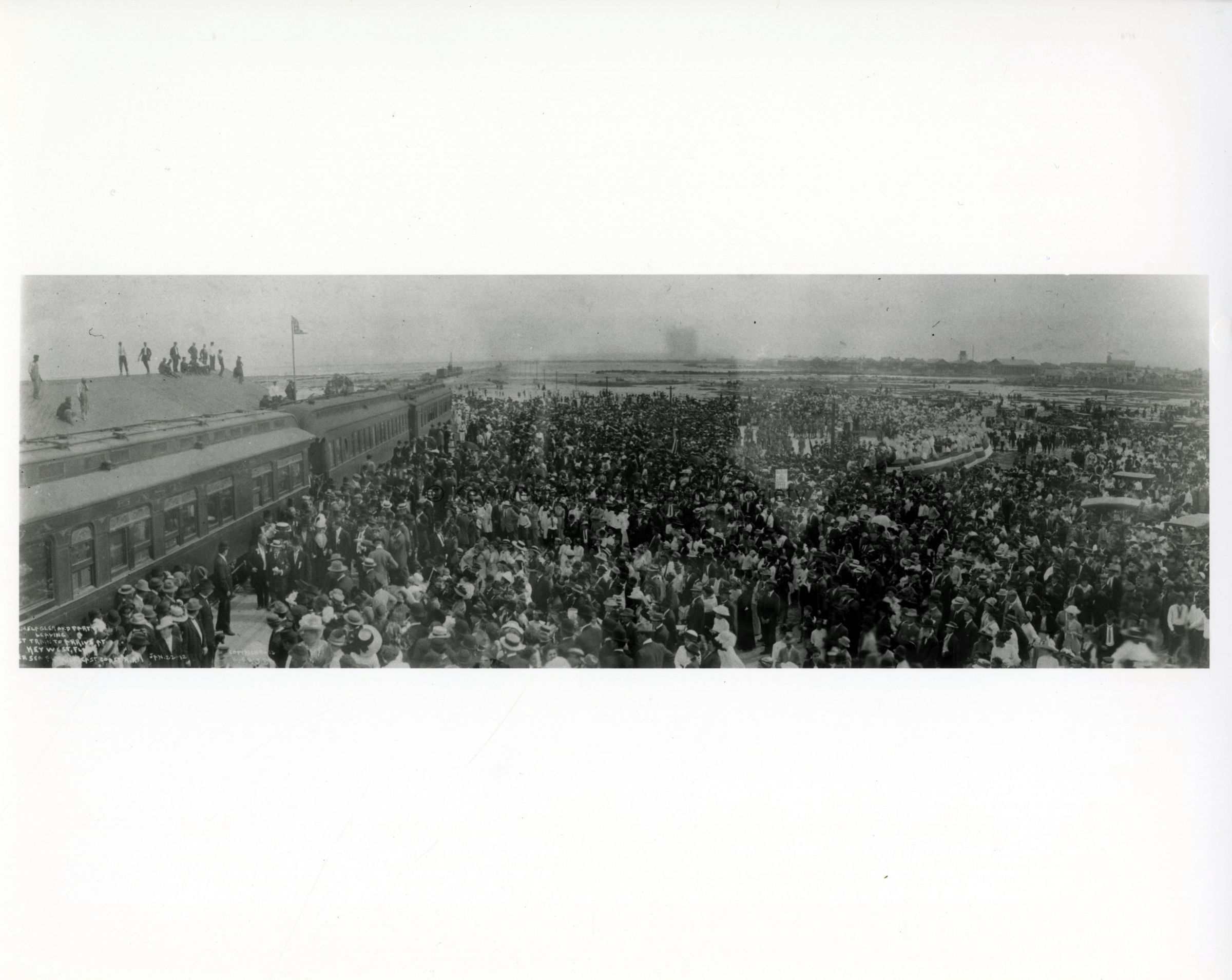 Black and white photograph of a large crowd greeting the first Florida East Coast Railway train to arrive at the Key West depot.