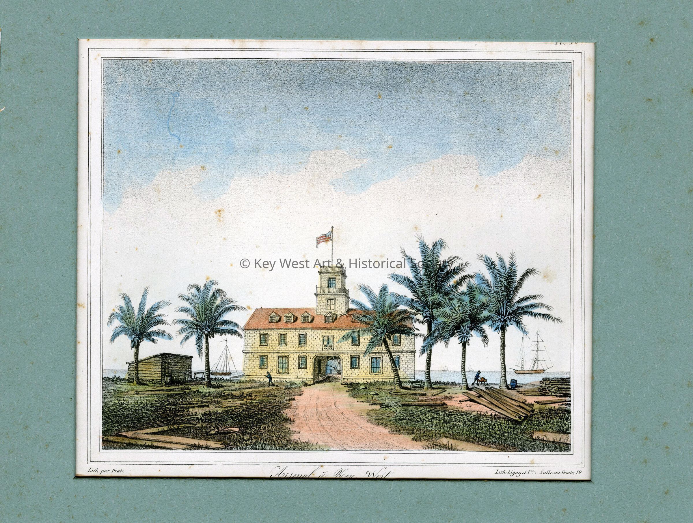 Hand tinted lithograph depicting the Arsenal in Key West in 1842. The building did not actually exist in Key West. It is likely an artist's interpretation of a structure based on Asa Tift's tower. The lithograph was published in 'Vues et souvenirs de l'Amérique du Nord' By Francis de Castelnau.