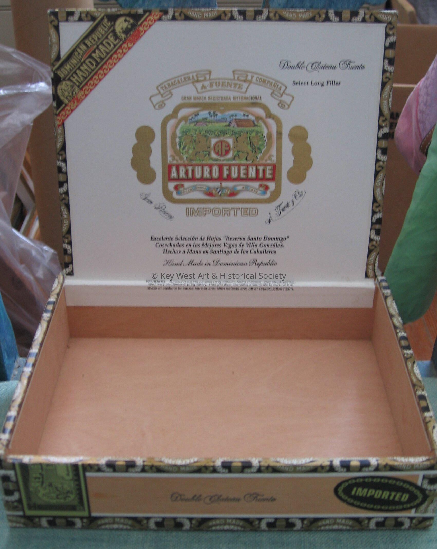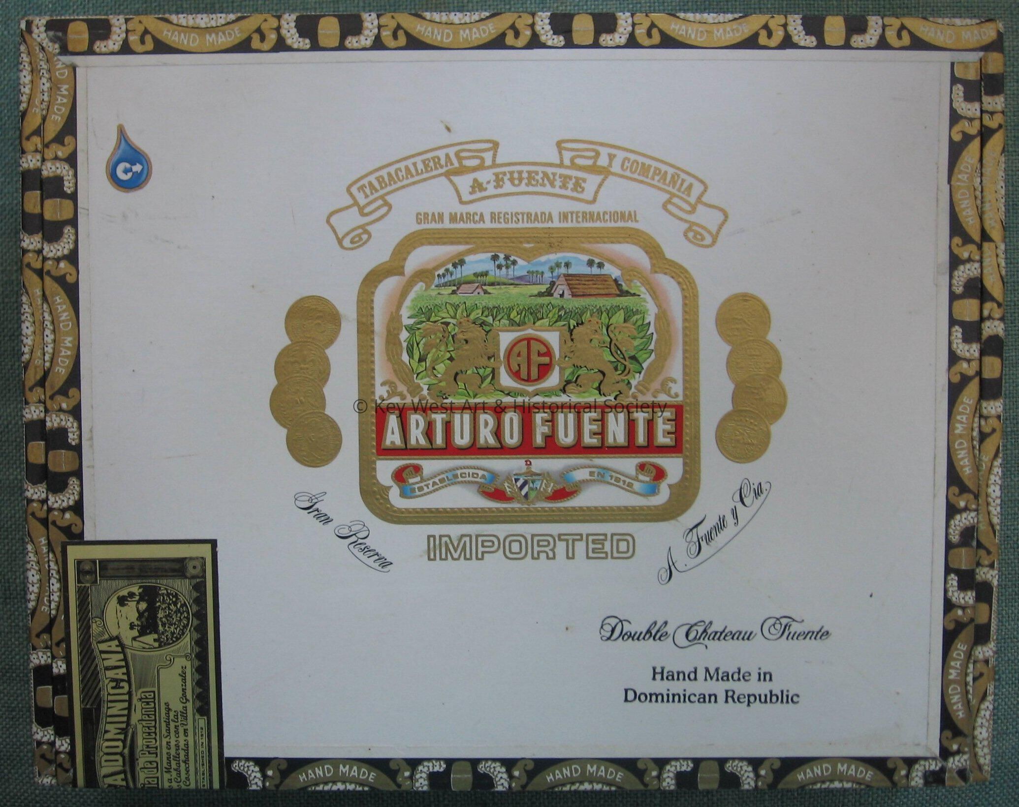Wood cigar box for hand made cigars from the Dominican Republic. Held 20 cigars. Made by Arturo Fuente. Box reads "Tabacalera y Compania A-Fuente"
