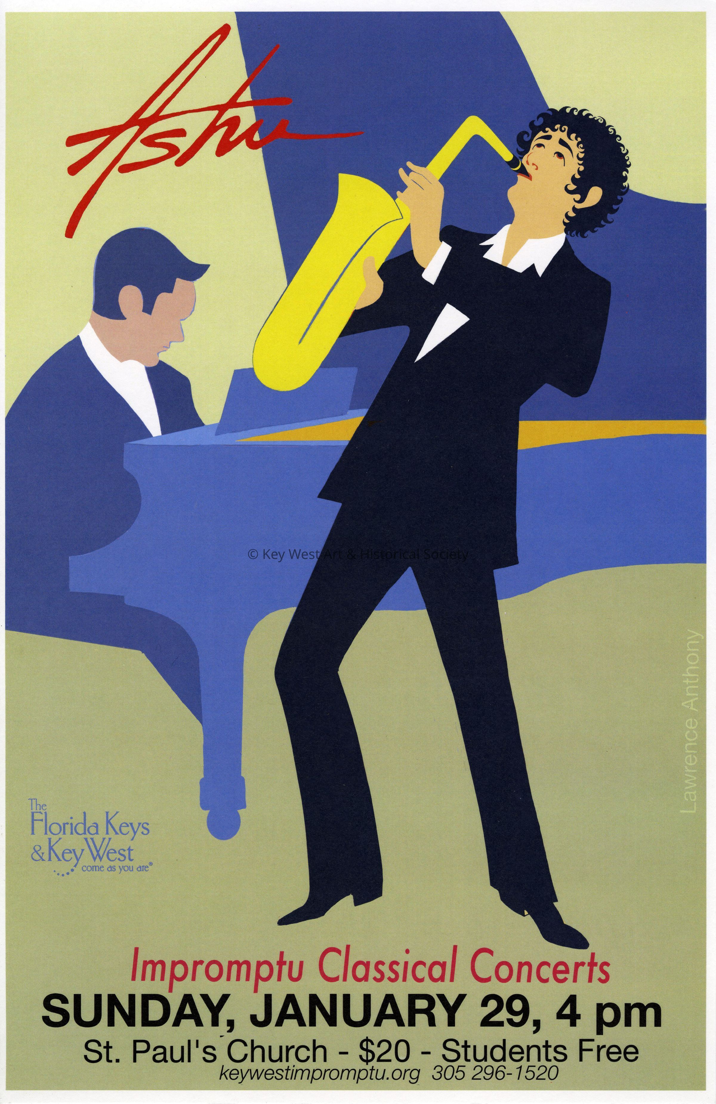 An advertising poster for Impromptu Classical Concerts featuring Ashu. The concert took place on January 29, 2017 at St. Pauls Church in Key West. The poster was designed by Lawrence Anthony.Collection