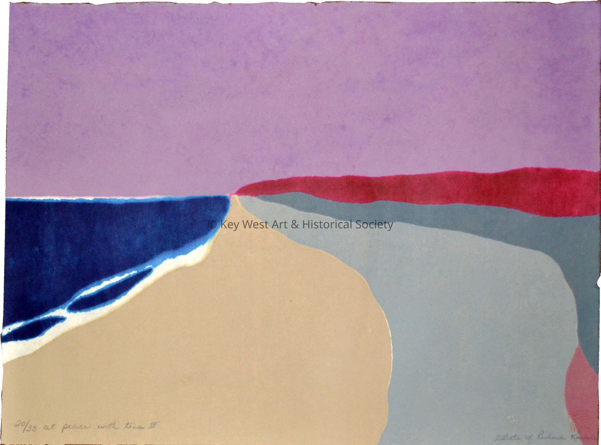 Woodcut by Richard Kemble depicting a beach and shoreline. Printed to deckled edge. Numbered 20/33.