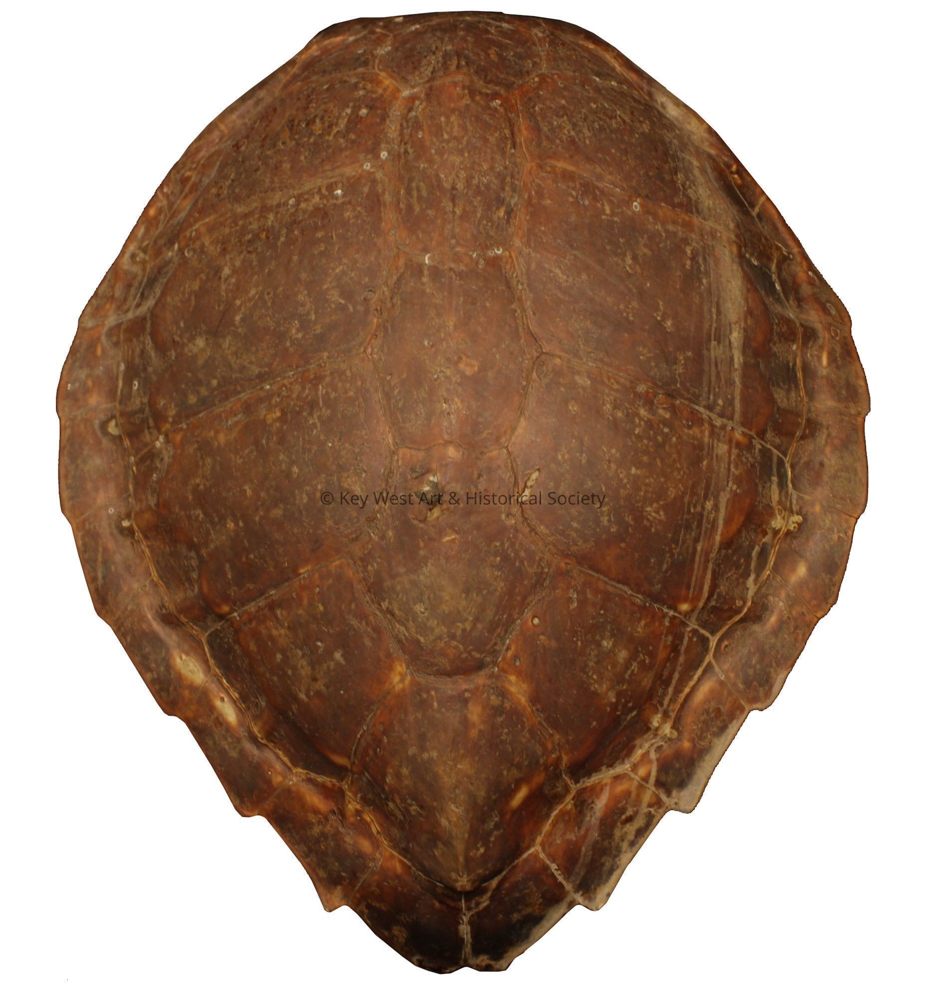 The shell of an Atlantic green sea turtle (Chelonia mydas). This species has been considered threatened in the southern Atlantic since 1978. For centuries the turtle industry was vital to the economy of Key West until 1971 when the Endangered Species Act was passed and limits on the trade of sea turtles began.Collection