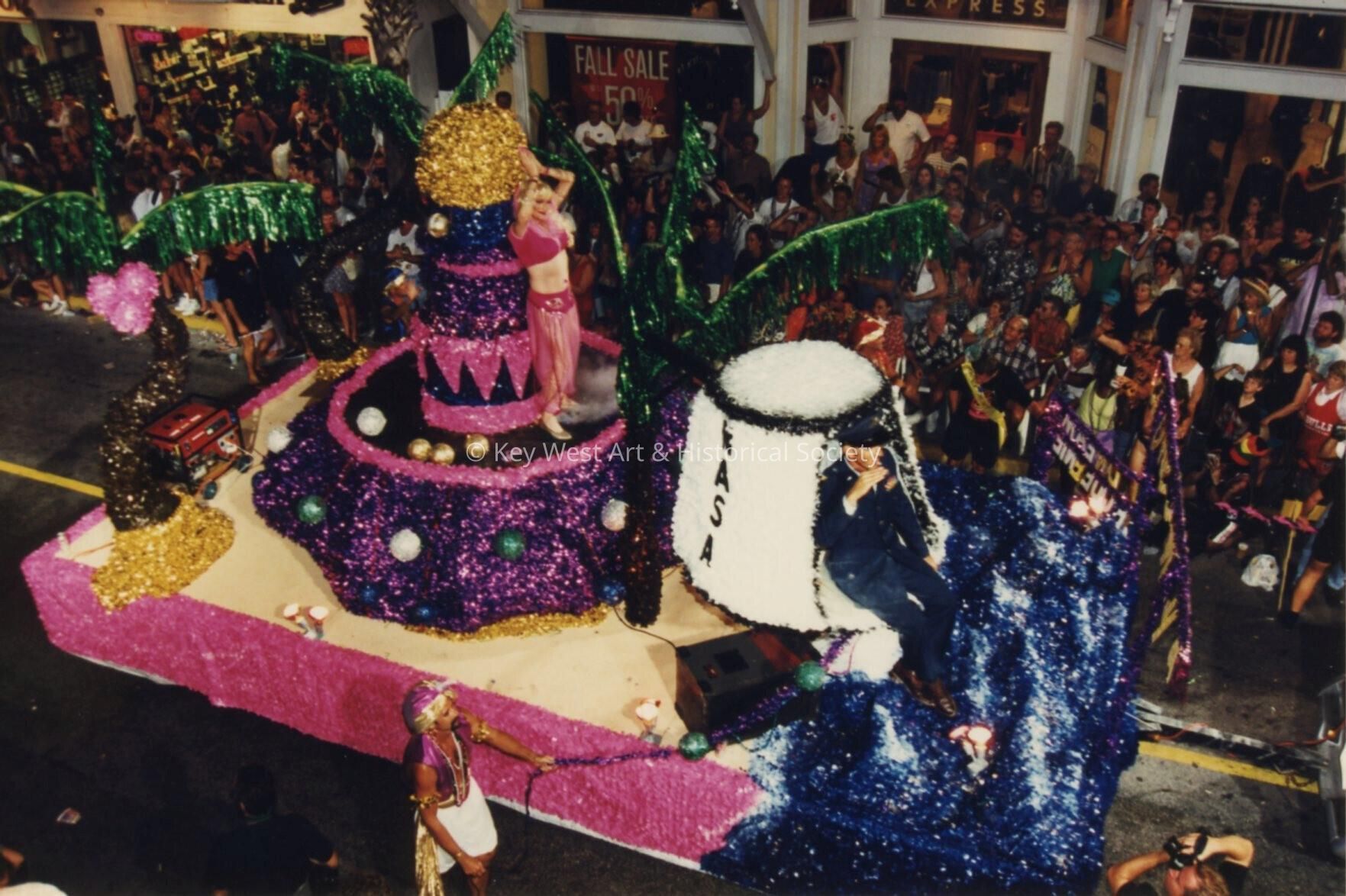 Color photograph of the Atlantic Shores Resort float in the Fantasy Fest Parade in 1997.