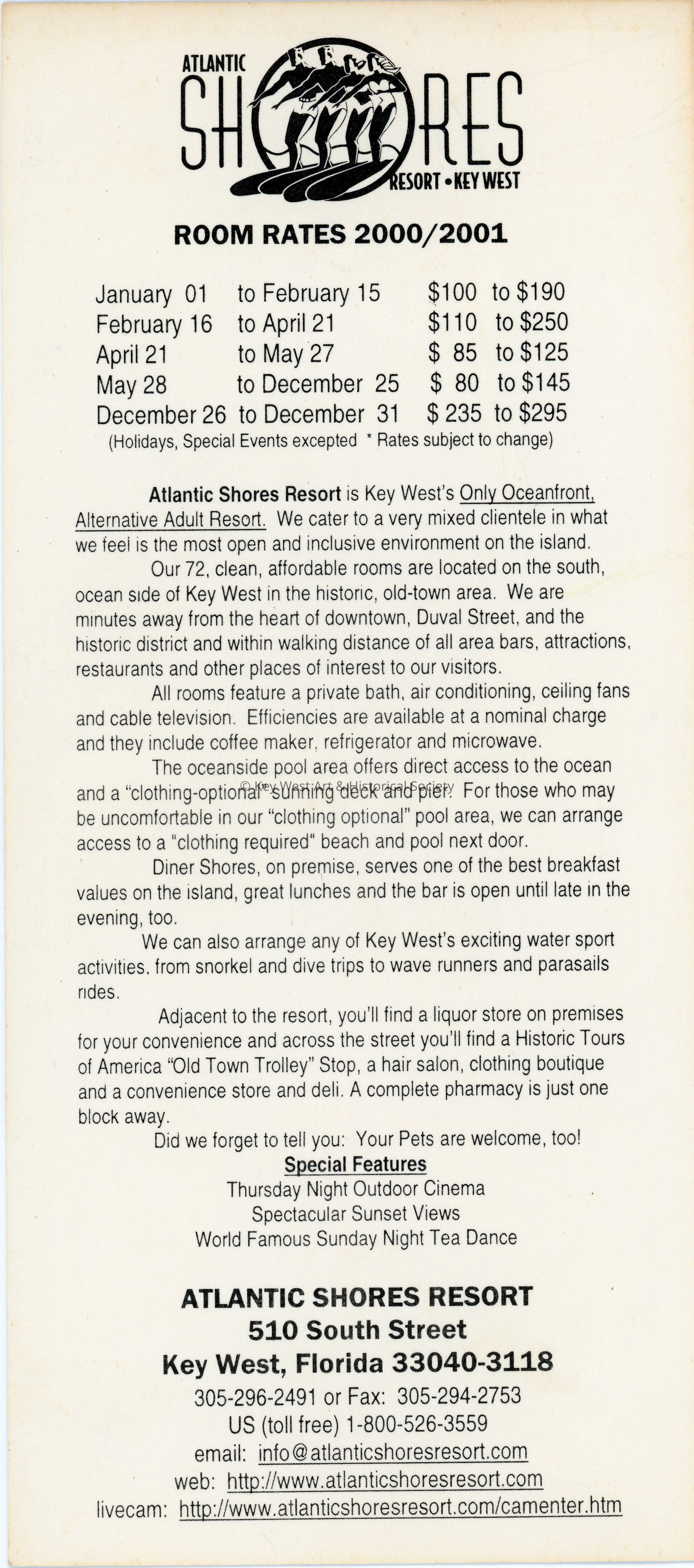 Single page flyer for the Atlantic Shores Resort in Key West. The front face of the flyer has color images of amenities while the back face has 2000/2001 room rates and a full description of the resort.Collection