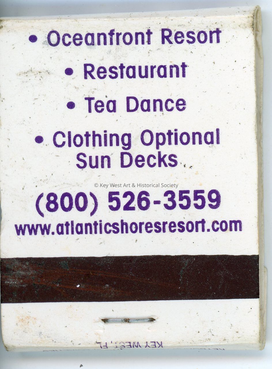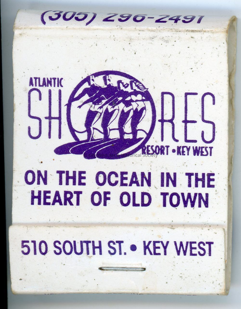 White matchbook with the logo and business information for the Atlantic Shores Resort, once located at 510 South Street in Key West.Use