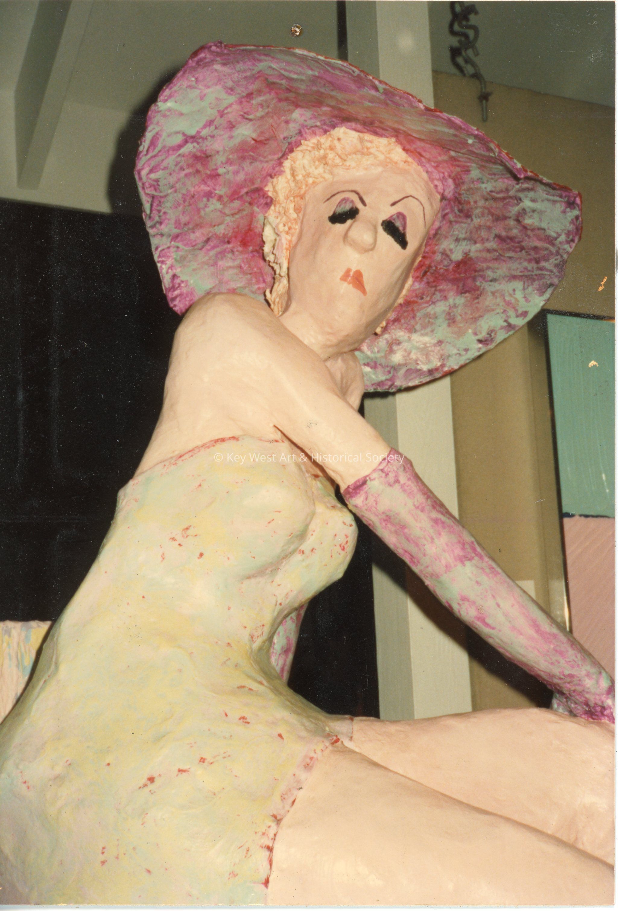 Color photograph depicting the paper mache sculpture 'Attitude' by Ron Clemons. The sculpture features a seated woman with short blonde hair wearing a large hat with her hand on her knee.