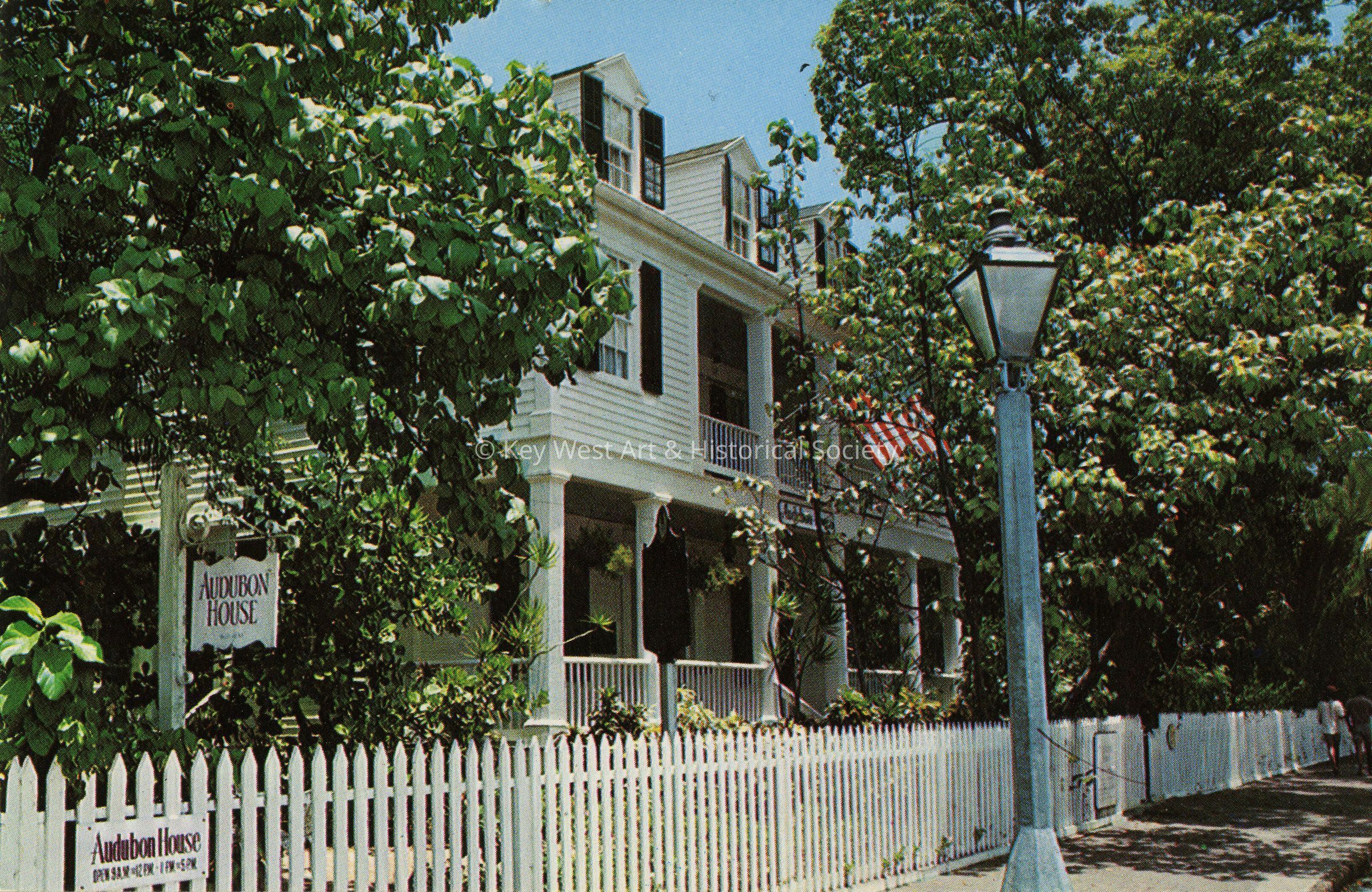 Postcard of the Audubon House as seen from corner of Greene and Whitehead streets. Caption on verso reads, 'This beautiful old waterfront home was built by Sea Captain John Geiger. John James Audubon, famous naturalist painter, resided here as a guest and is reputed to have painted the Great White Crowned Pigeon in the Geiger Tree on the grounds. The home has been restored and is now open to the public. The Elephant Folio of Audubon's Birds of America series is on exhibit here as well as imported antique furniture from England.'Subject Person/Organization