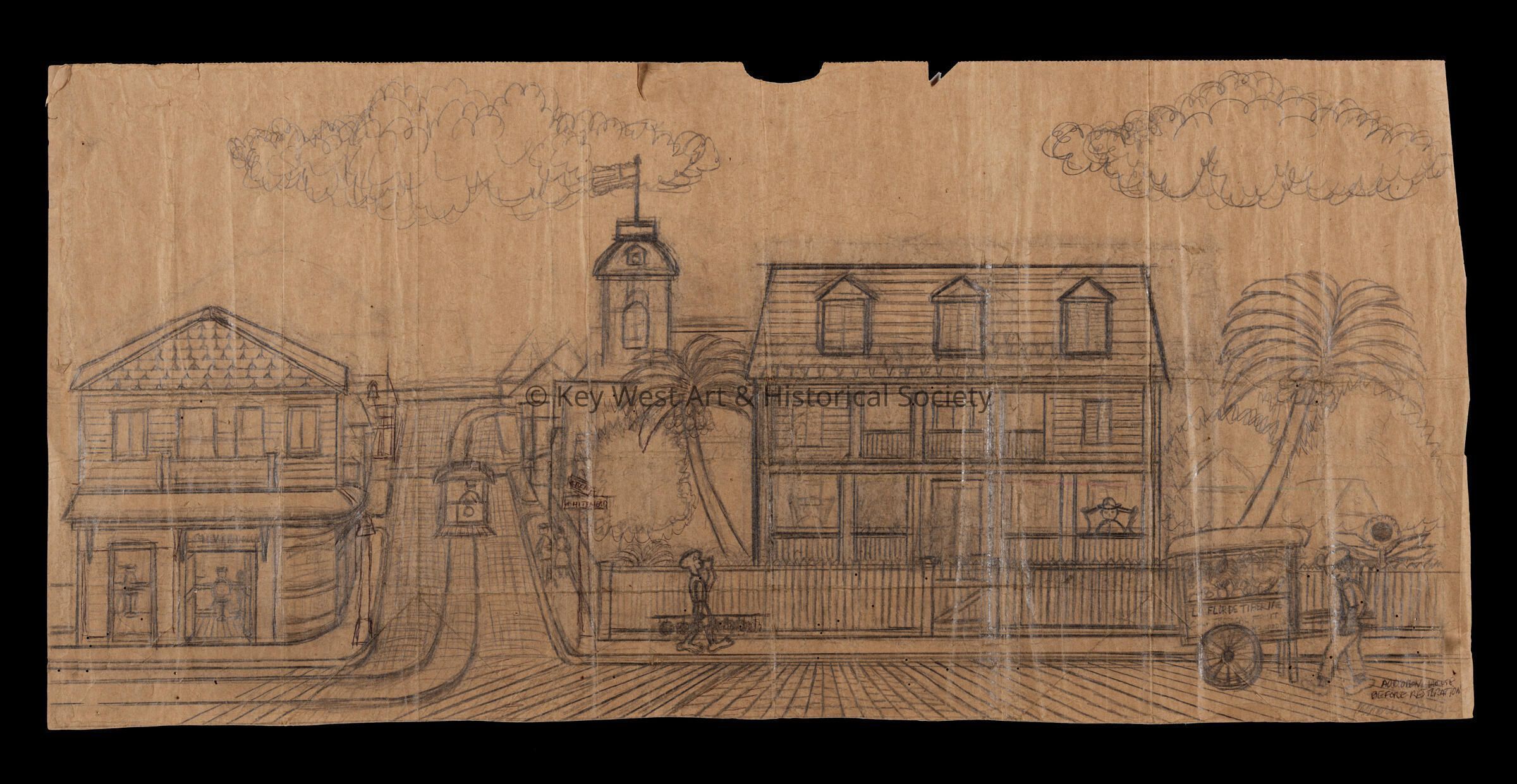 Pencil sketch on an unfolded paper bag by Mario Sanchez depicting the Audubon House, before its restoration, on the corner of Greene and Whitehead streets. A fruit vendor with his cart and the Spanish Lime boy are passing in front.Type of Drawing