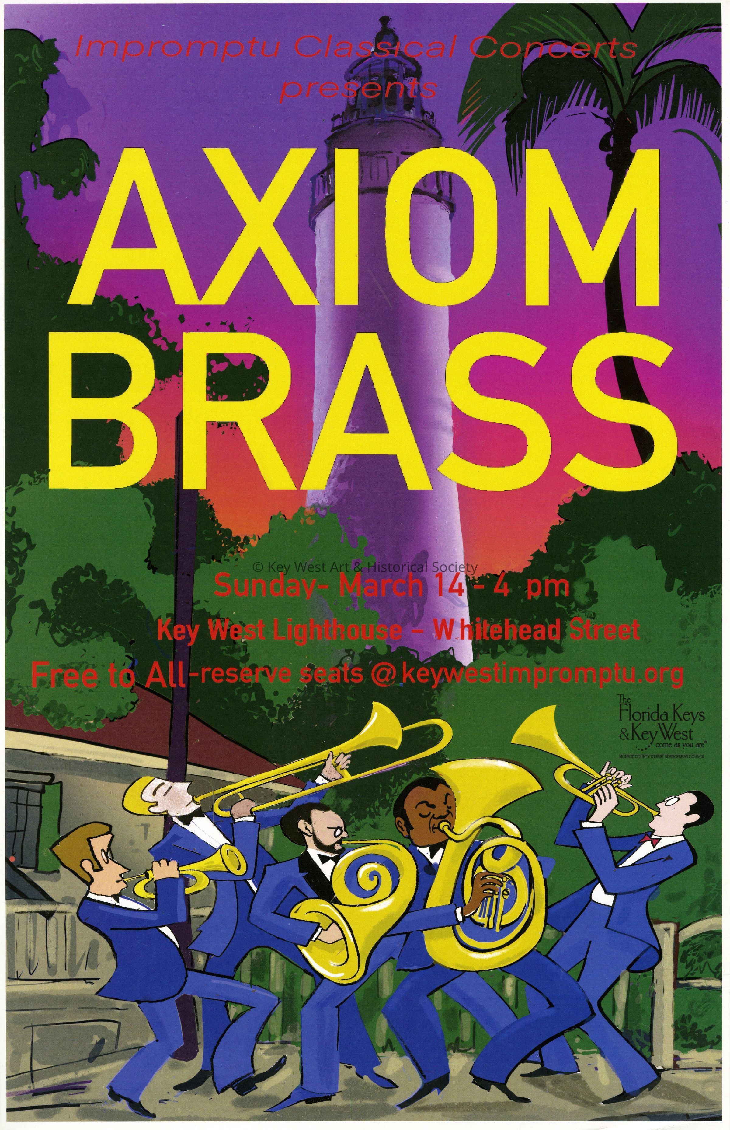 An advertising poster for Impromptu Classical Concerts entitled 'Axiom Brass'. The concert took place on March 14, 2021at the Key West Lighthouse at 938 Whitehead Street.Collection