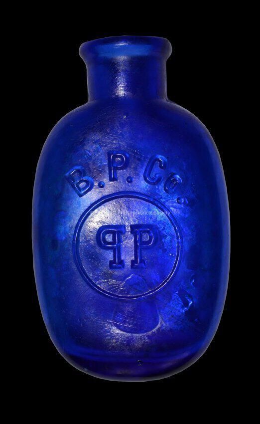 Blue glass medicine bottle embossed with 'B.P. Co. PP', representing the Brunswick Pharmaceutical Company. The bottle likely held pills for indigestion. The bottle was originally excavated by the donor's mother, Grace Curlee, during the restoration of Fort Zachary Taylor in the 1960s.Collection