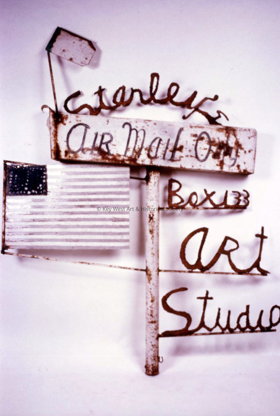Freestanding sculpture by Stanley Papio depicting a decorative mailbox with an American Flag and inscriptions both painted and cut out reading, 'Stanley's Art Studio, Box 133, Air Mail Only'.Type of Sculpture