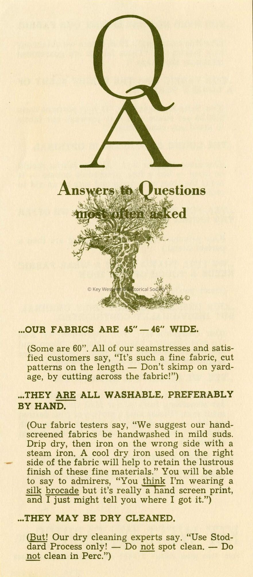 A double-sided 'Answers to Questions most often asked' (FAQ) notecard produced by the Key West Hand Print Fabrics factory for the 1972 season. Samples in various colors and patterns were sent via mail to potential customers along with a FAQ card.Collection
