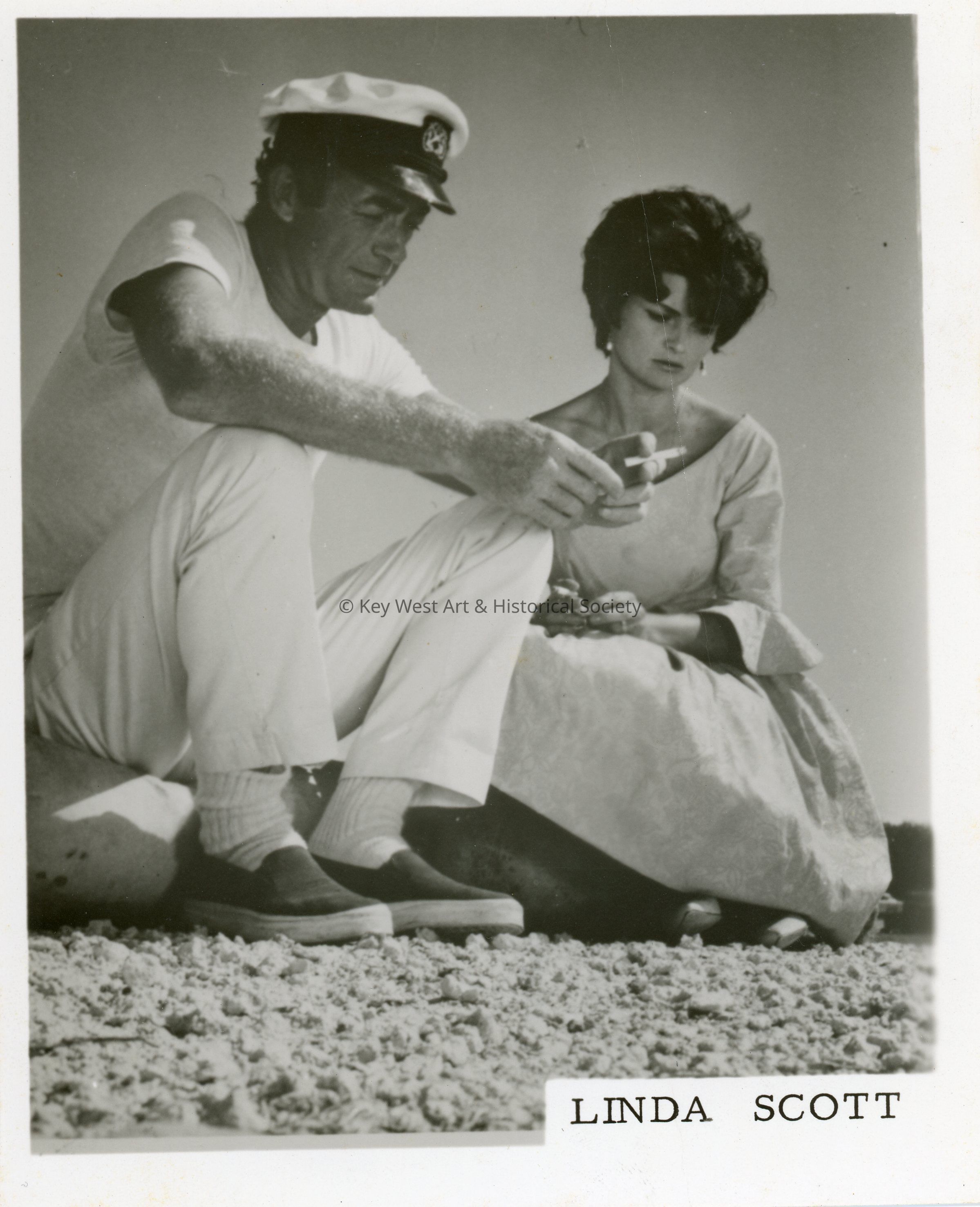 Black and white photograph of actress Linda Scott and Mark Stevens on the set of 'Escape From Hell Island,' originally called 'The Man in the Water.' Scott's real name was Ann Rouzer.