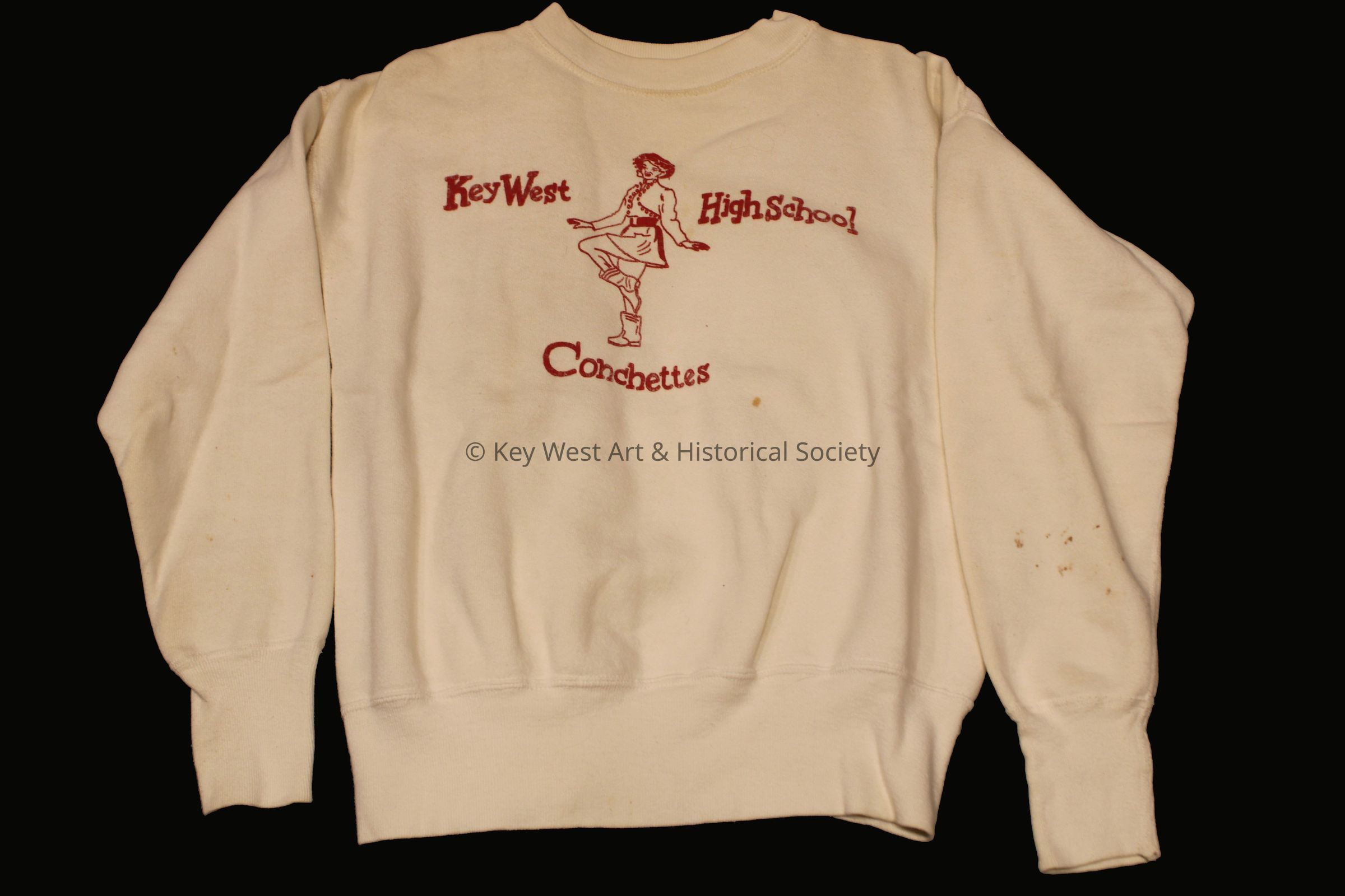 Off-white Key West High School Conchettes pullover. The sweater has a red print of a Conchette in one of the original costumes.Collection