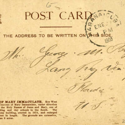 Postcard depicting the Convent of Mary Immaculate on Truman Avenue.  The caption reads, ‘Key West, Florida, Convent of Mary Immaculate’.  The notation on verso, ‘Convent of Mary Immaculate.  Key West possesses in the Convent of Mary Immaculate, under direction of the Sisters of the Holy Names of Jesus and Mary, one of the largest boarding and day schools in the South.  The spacious gray stone building, erected in 1874, and enlarged in 1904, is 275 feet in length.  The grounds are extensive, covering more than 8 acres.'Subject Place