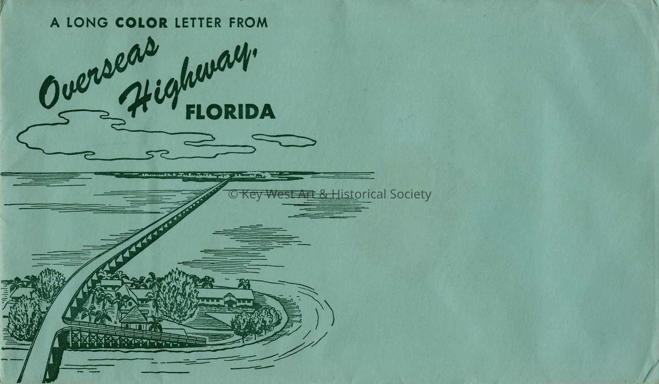 Pre-printed souvenir envelope intended for purchase by tourists who would then mail it to a friend or relative. The letter that accompanies it details bridges of the Overseas Highway and some of the attractions along the route.