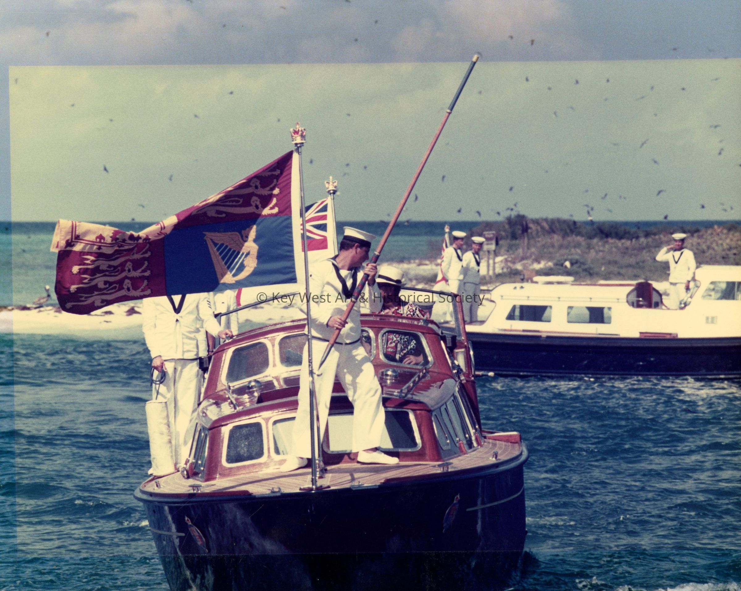 Color photograph of a launch belonging to Her Majesty's Yacht Britannia carrying Queen Elizabeth II and Prince Philip, the Duke of Edinburgh, to Fort Jefferson in Dry Tortugas National Park for a tour on May 8, 1991.Photograph Details