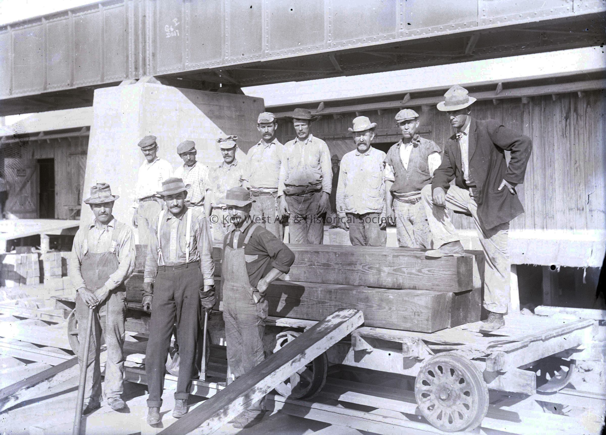 Black and white dry plate glass negative of the unknown workers unloading timbers under the Seven Mile Bridge at the railroad camp on Pigeon Key. The image was taken during the construction of Seven Mile Bridge on the Overseas Railway.