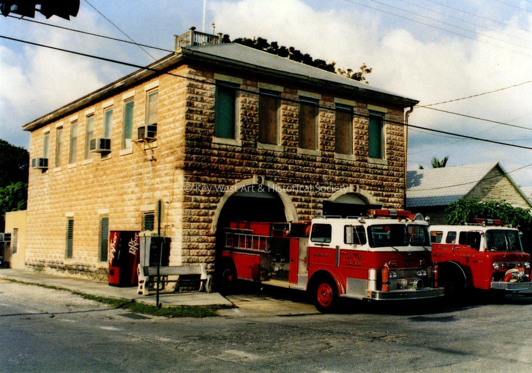 Postcard depicting two fire trucks at Fire Station Number 3 at the corner of Grinnell and Virginia streets.  Notation on verso reads, 'Key West, Florida.  Number three fire station, corner of Grinnell and Virginia, is the oldest active fire station in the state of Florida.  It was built in 1907.'Subject Place