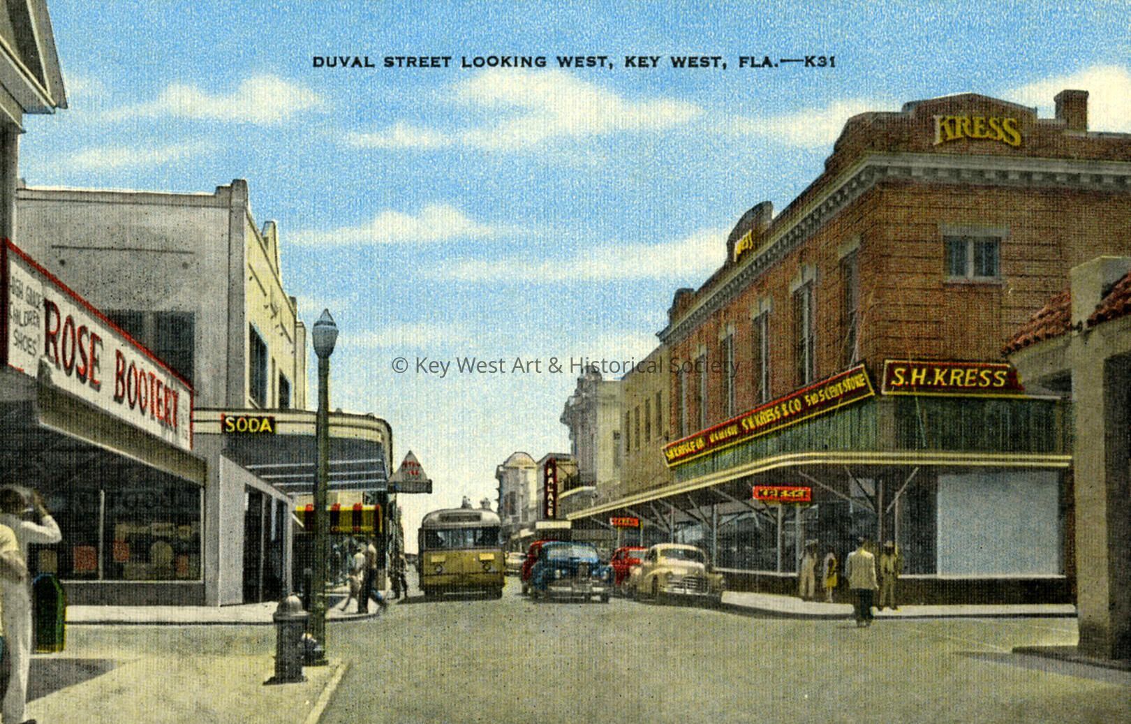 Postcard depicting the 500 block of Duval Street with the S.H. Kress store, Rose Bootery and the Boat Bar.and other commercial buildings. The caption reads, ‘Duval Street Looking West, Key West, Fla.’ The caption on the verso reads, ‘Cigar manufacturing, sponge fishing and considerable trade in fruits, fish, turtles and vegetables are a part of Key West's daily business. It is a modern city in a historically old part of the U.S.A.'Subject Place