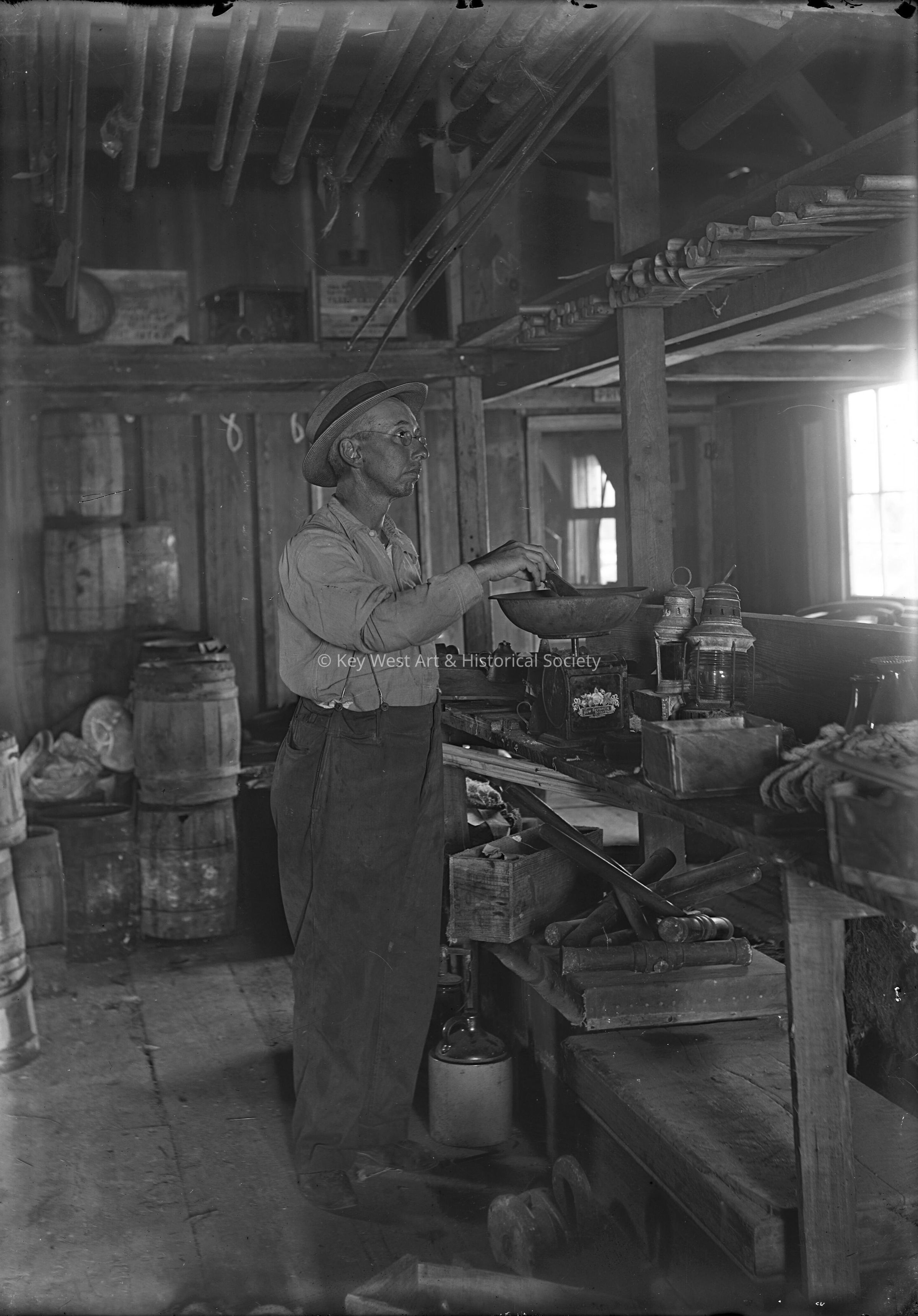 Black and white dry plate glass negative of the interior of the tool shop at the railroad camp on Pigeon Key. The image was taken during the construction of Seven Mile Bridge on the Overseas Railway.