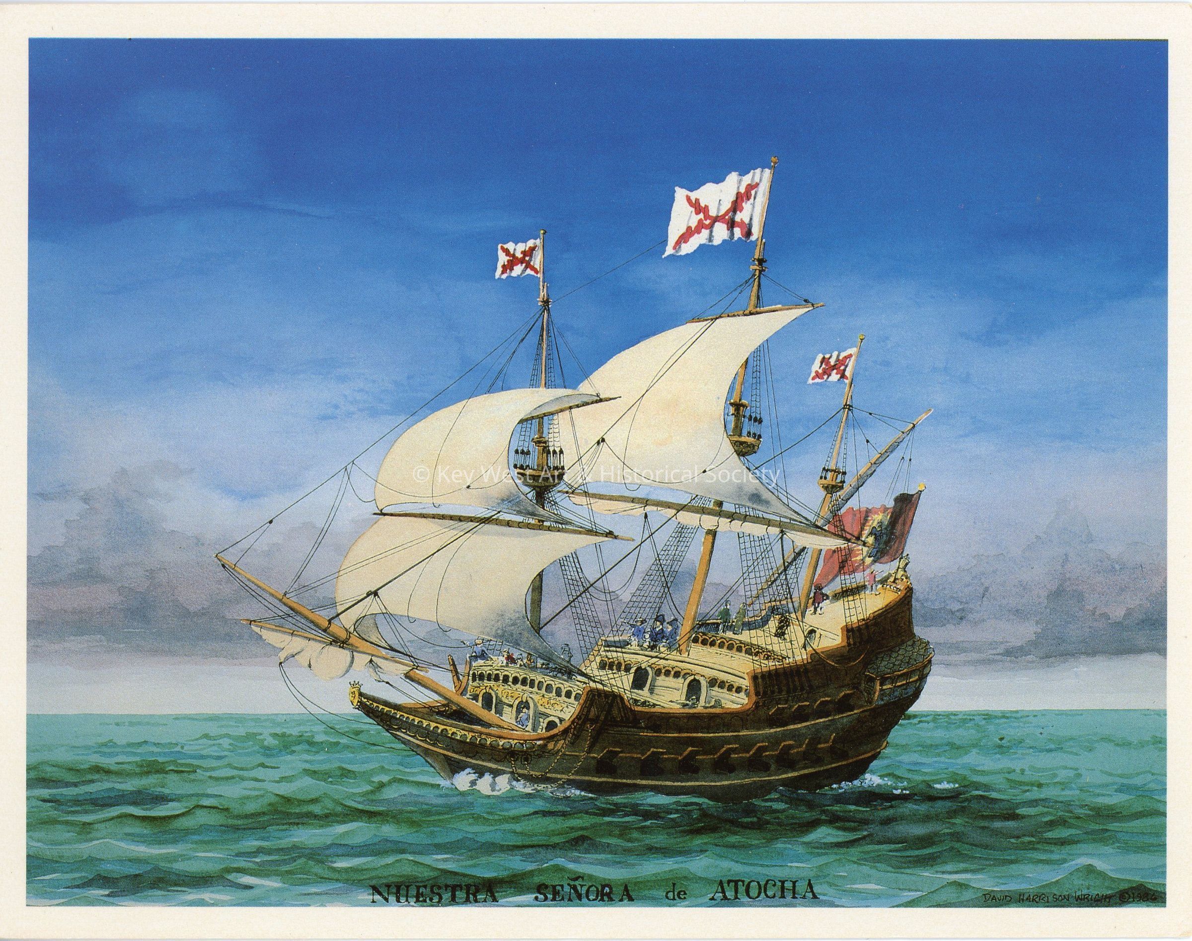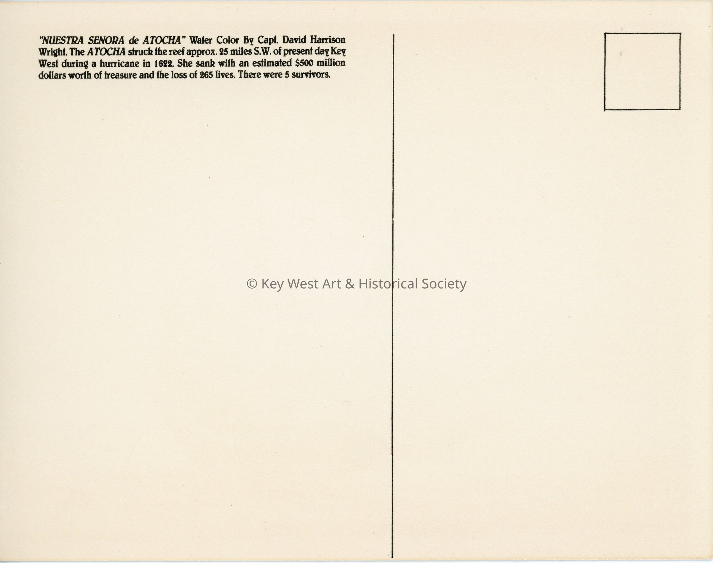 Postcard with a watercolor illustration of the Spanish galleon Nuestra Senora de Atocha. The ship sank off the shores of Key West in 1622. The illustration was done by David Harrison Wright in 1986.Subject Place