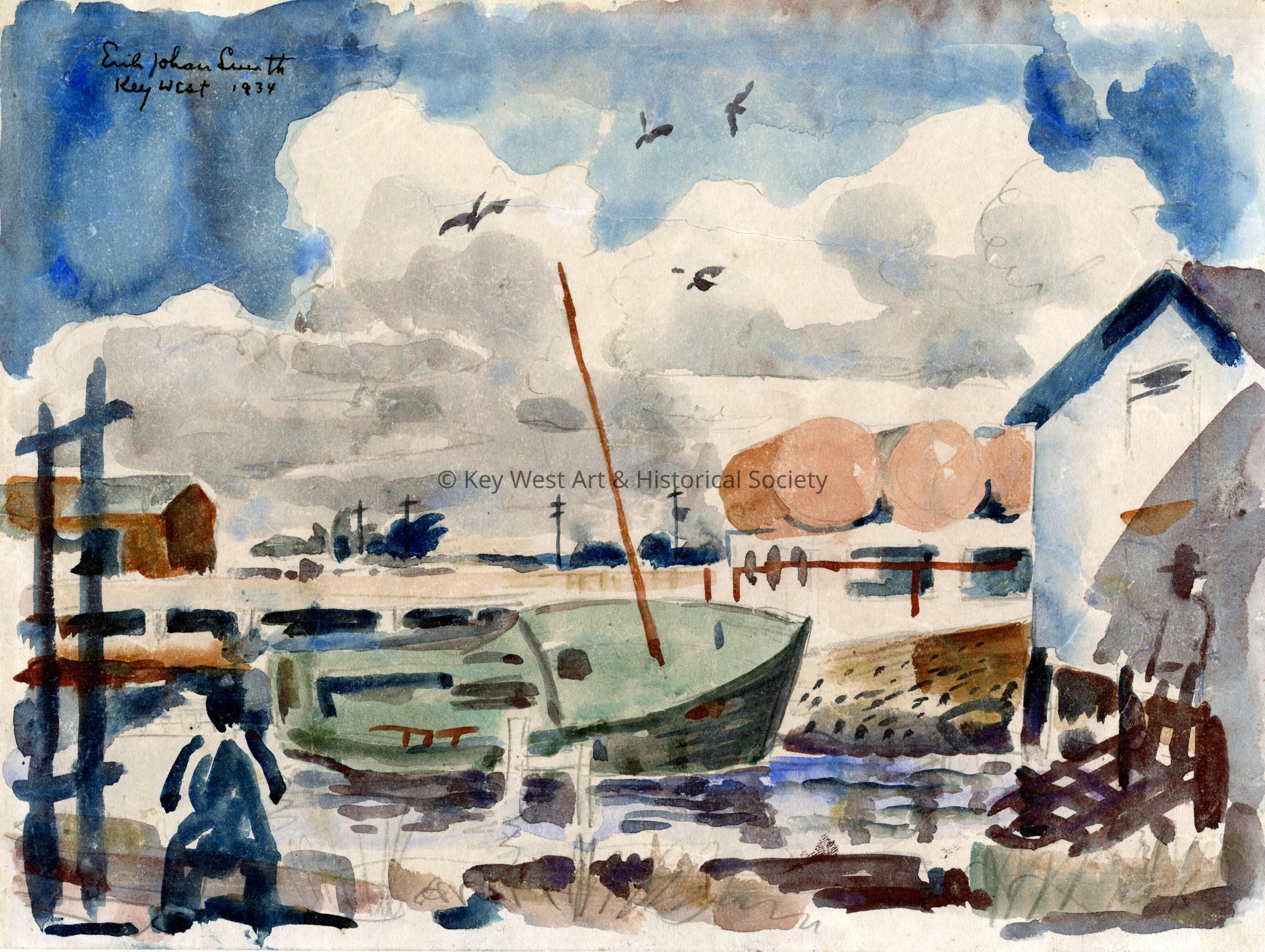 Watercolor by Erik Johan Smith depicting a green sailboat careened in the Key West Bight. Waterfront workers and buildings in the foreground. Watercolor produced as part of the WPA project in Key West during the Great Depression.Artwork Details