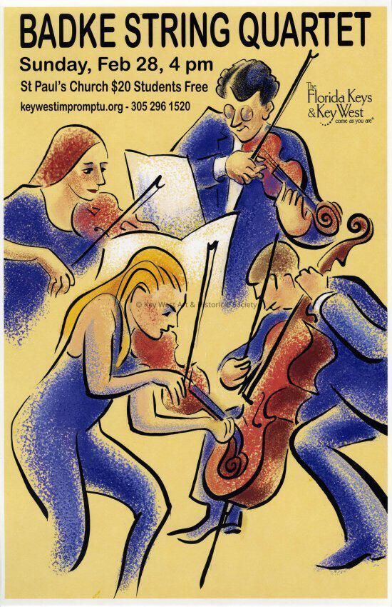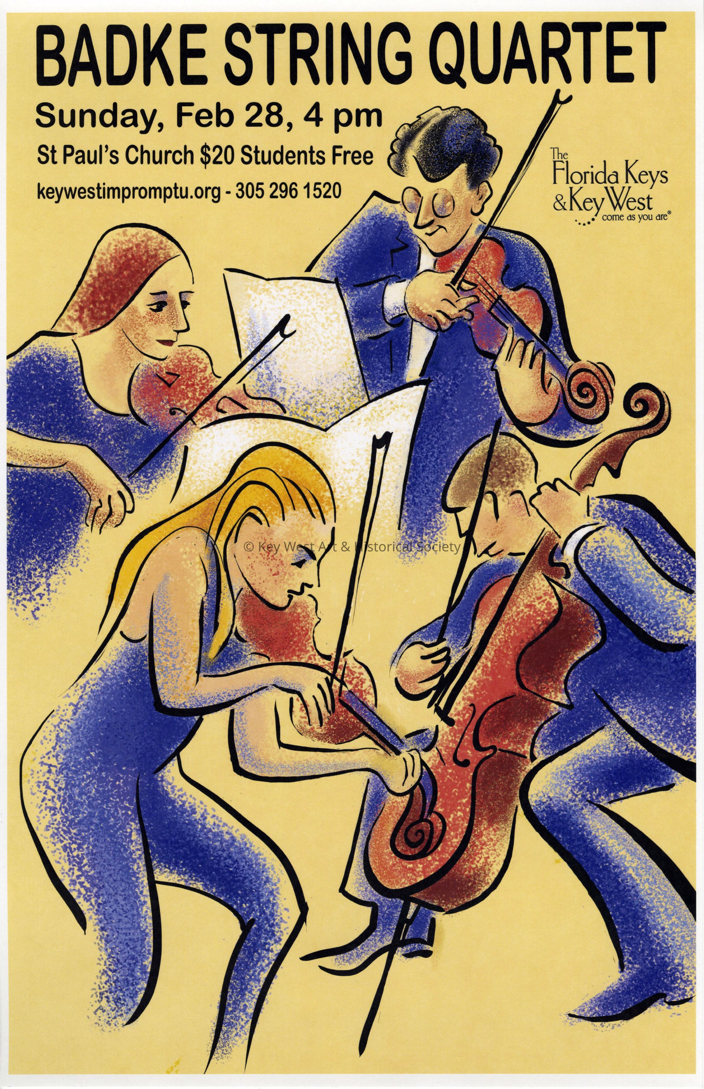An advertising poster for Impromptu Classical Concerts featuring Badke String Quartet. The concert took place on February 28, 2016 at St. Pauls Church in Key West. The poster was designed by Lawrence Anthony.Collection