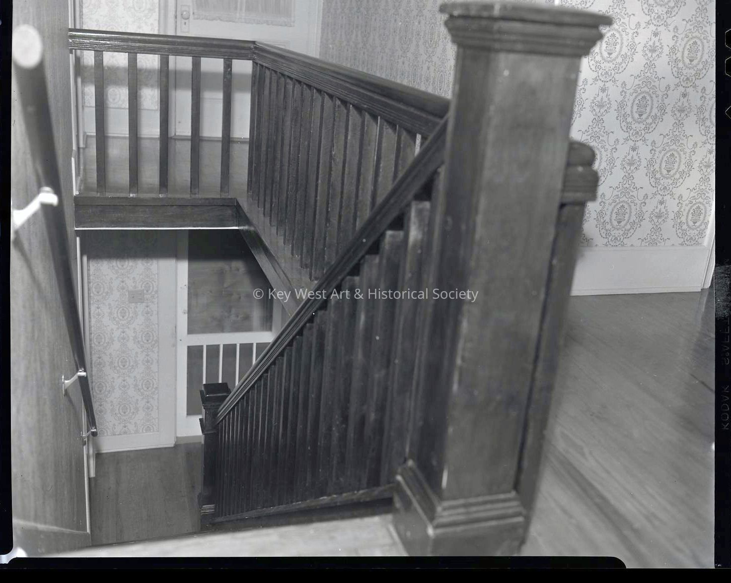 Black and white photographic negative depicting the interior staircase of the Bahama House at 730 Eaton Street.